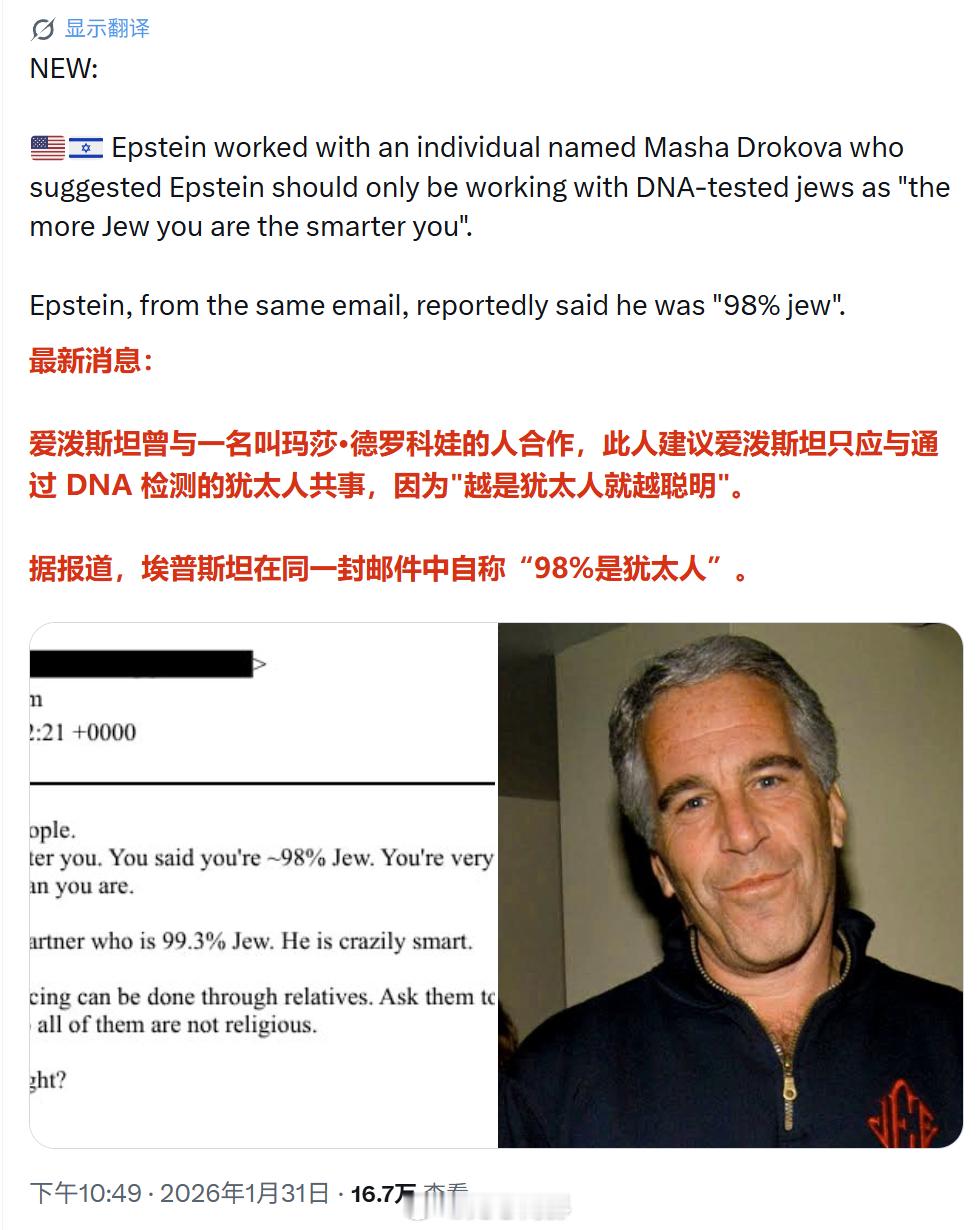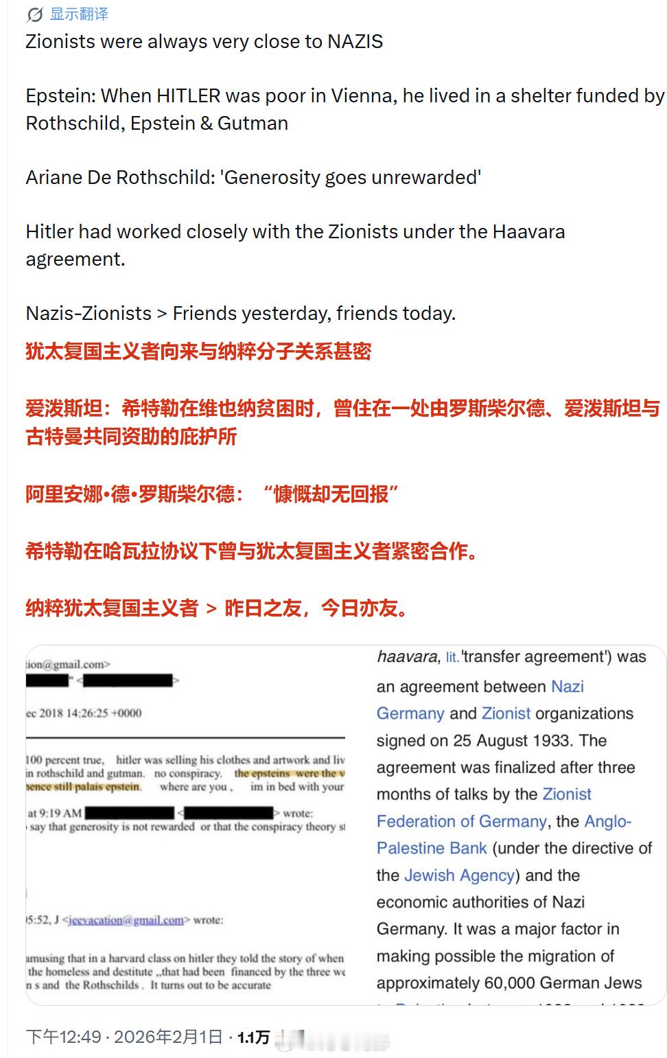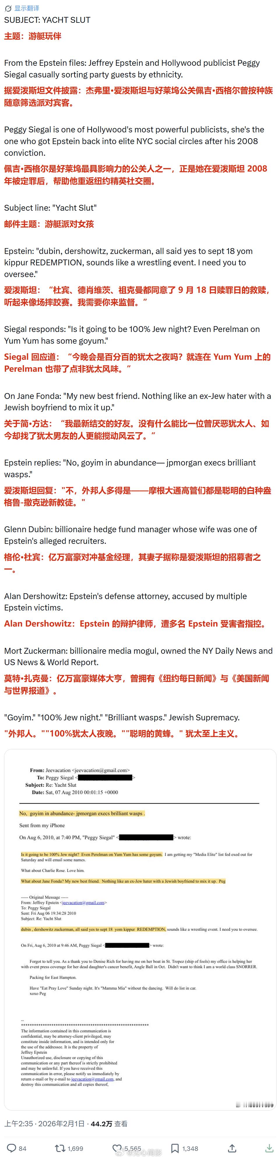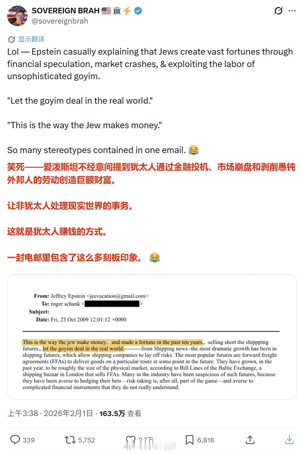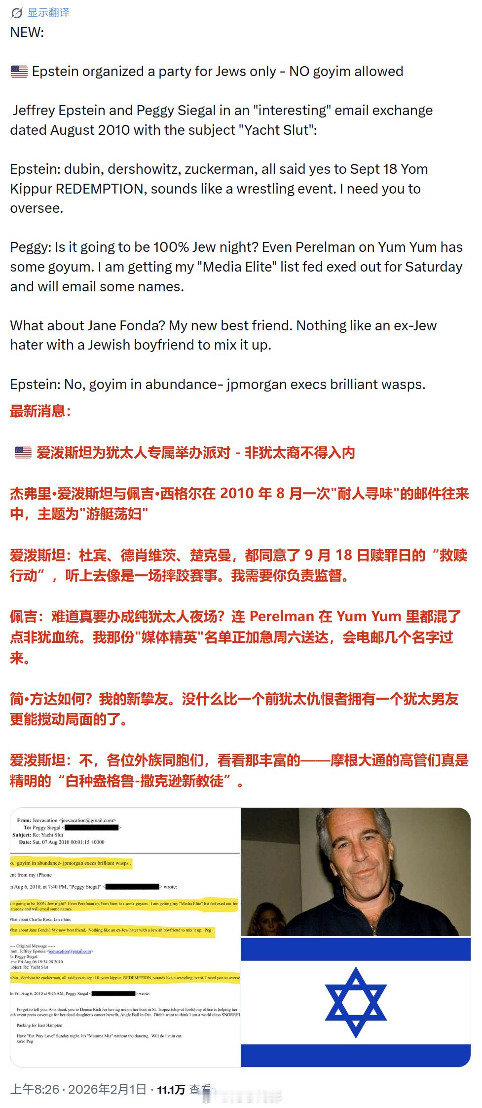 爱泼斯坦文件曝光,可能在海外引起新一轮的“反犹”声浪。比如昨天曝光是“特朗普被以色列操控”,“特朗普的犹太女婿库什纳是他的‘真正大脑’”,以及多封邮件里,爱泼斯坦强调自己的犹太人身份,还有和罗斯柴尔德家族的通信,办什么“100%犹太人之夜”,并把非犹太人称为“外邦人”,已经引发更多关于犹太精英喜欢撒旦邪教,喜欢以婴儿献祭的阴谋论和猜测,并进一步升高了欧美民间对犹太人的不满情绪。