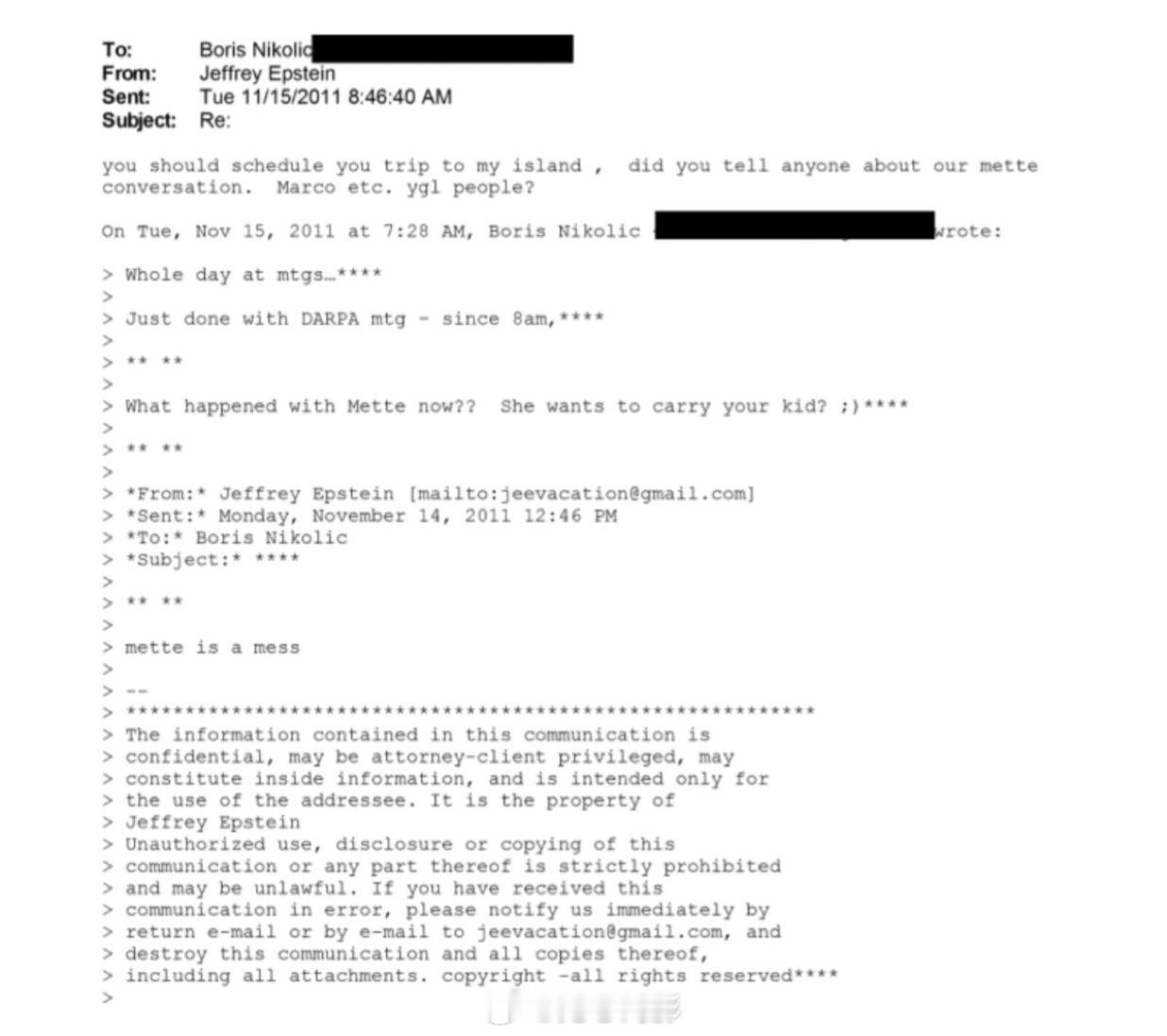 🔴(图4)爱泼斯坦与鲍里斯·尼科利奇(盖茨的顾问)在 2011 年讨论挪威王储妃梅特-玛丽特。爱泼斯坦:梅特真是一团糟。尼科利奇:梅特现在怎么了??她想怀你的孩子? ; )(这里是个鬼脸符号)爱泼斯坦:你应该安排一下去我岛上的行程,你有没有跟任何人提起过我们关于梅特的谈话?比如马可之类的人。全球青年领袖(YGL)的人?