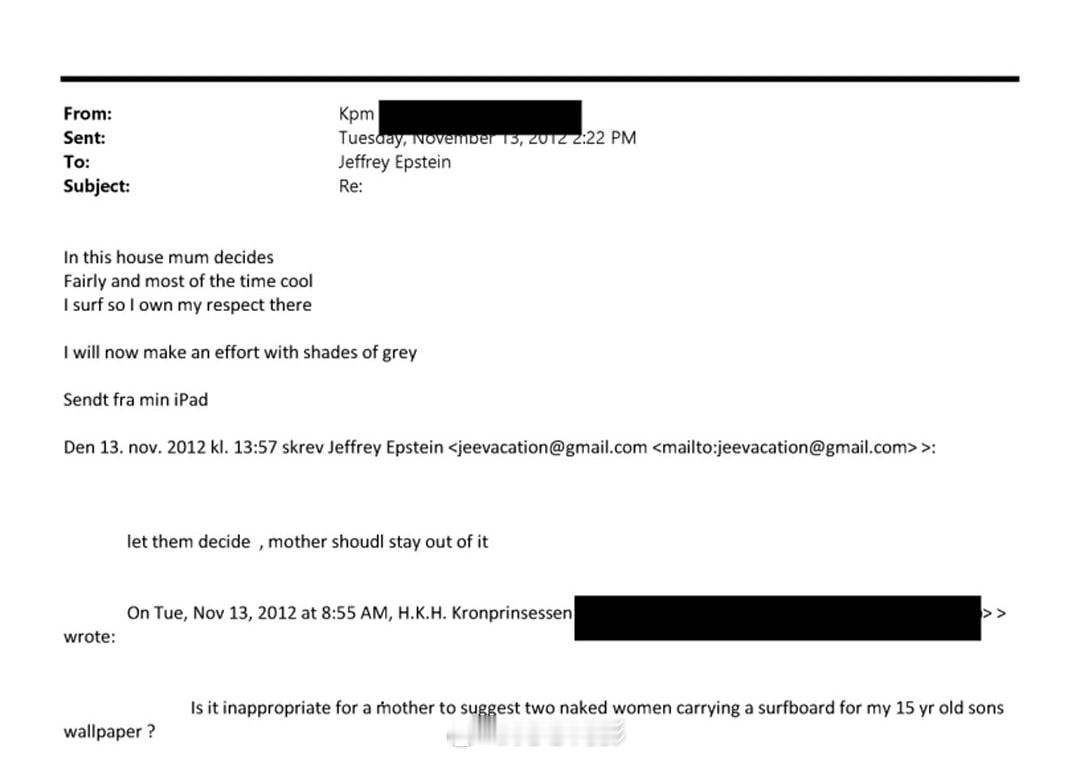 🔴(图2)挪威王储妃梅特-玛丽特在 2012 年向爱泼斯坦寻求“耐人寻味”的建议:梅特:如果一位母亲建议用两个裸体女人扛着冲浪板的照片作为我 15 岁儿子的壁纸,这合适吗?爱泼斯坦:让他们自己决定,母亲不该插手。梅特:在这个家里,妈妈说了算。公平且大多数时候都很酷。我会冲浪,所以在那方面我赢得了尊重。我现在要在灰色地带下点功夫了。