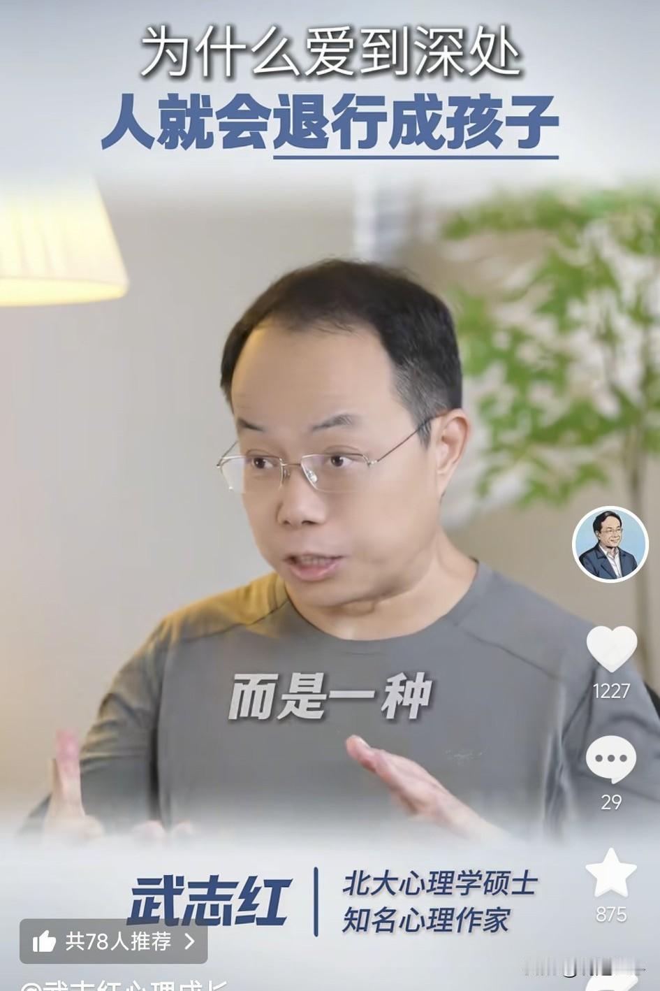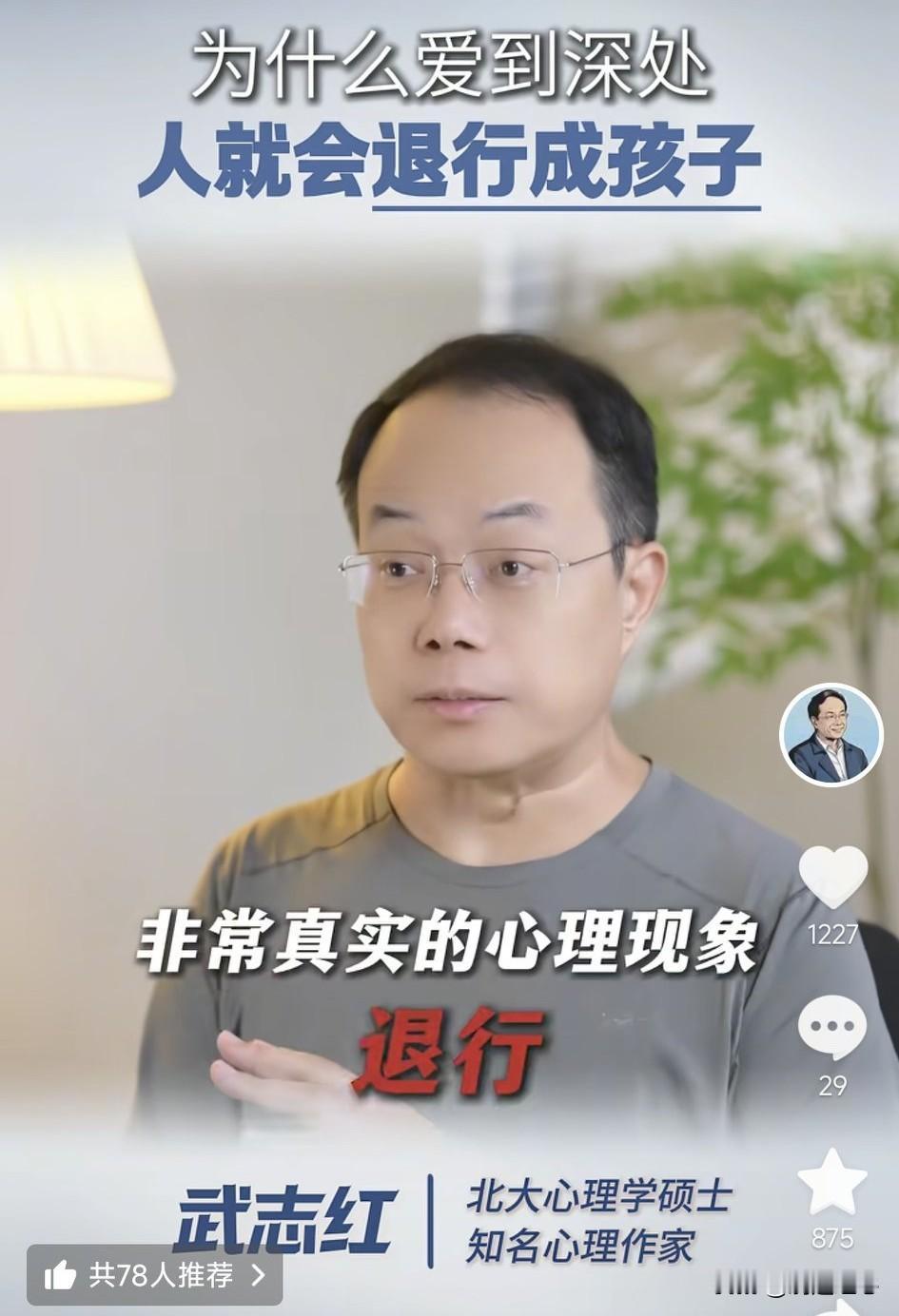 知名心理作家武志红:如果你来自一个否定、忽视、控制的家庭,我们恋爱的感觉,往往是委屈、愤怒,于是一个残酷的循环出现了,你越亲密关系越容易崩。 很多人不知道一件事:恋爱到深处人真的会变成孩子,不是幼稚,不是作,而是一种非常真实的心理现象叫退行。 你有没有发现一旦真的爱上一个人,你会突然变得敏感、依赖、情绪起伏,开始害怕失去、害怕被冷落,在意一些你明明早就该看开的事,这不是你变差了,而是一个事实,你终于不再防御了,只有在感到安全的时候人才敢退回到自己最早受过伤的地方。 所以谈恋爱从来不只是谈现在这个人,在更深的心理层面你其实是在无意识里把亲密关系当成一次自救,你在等一个人懂你、包容你、不嫌你麻烦,说的再直接一点你在等一个理想的父母,问题也恰恰出在这里。 武志红指出,我们不是故意搞砸关系,你只是把那个从小没被好好对待的自己带进了爱情里。很多人一遍遍爱错人、选错人,不是不长记性,而是在用重复试图完成一次迟到的治疗。但真相是恋人不是治疗师,爱情也不是心理治疗。走出这种循环靠的从来不是换一个更好的人,而是回到源头修复那套在原生家庭里形成的心理结构。 如果你在这段话里看到的不是道理,而是你自己的关系经历,那你该修复的从来不是爱情,而是你自己。 我觉得武志红说的非常对,就是你在那个人面前,不经意间就变回了孩子。 不知你有没有这样的体验,和某个人相处得越久,越容易流露出孩子般的脾气。那些被岁月掩埋的、最本真的快乐自我,会悄然苏醒。这并非刻意为之,而是内心自然而然的回归。 所以,当你发现自己突然变得格外开心,愿意毫无保留地敞开内心,这或许就是一个重要信号:你遇见了对的人。 大家觉得呢?