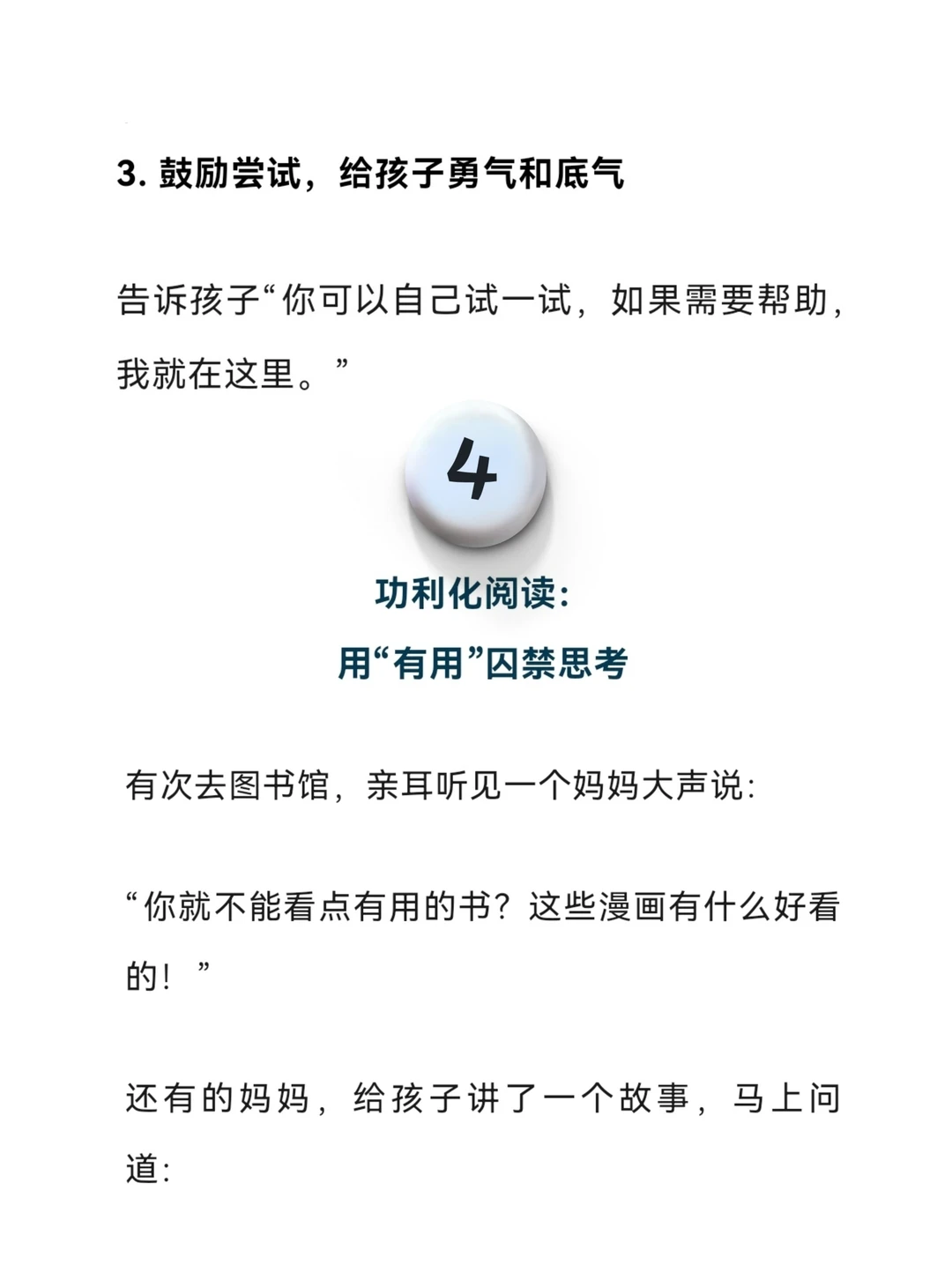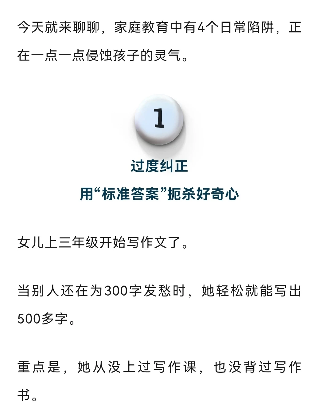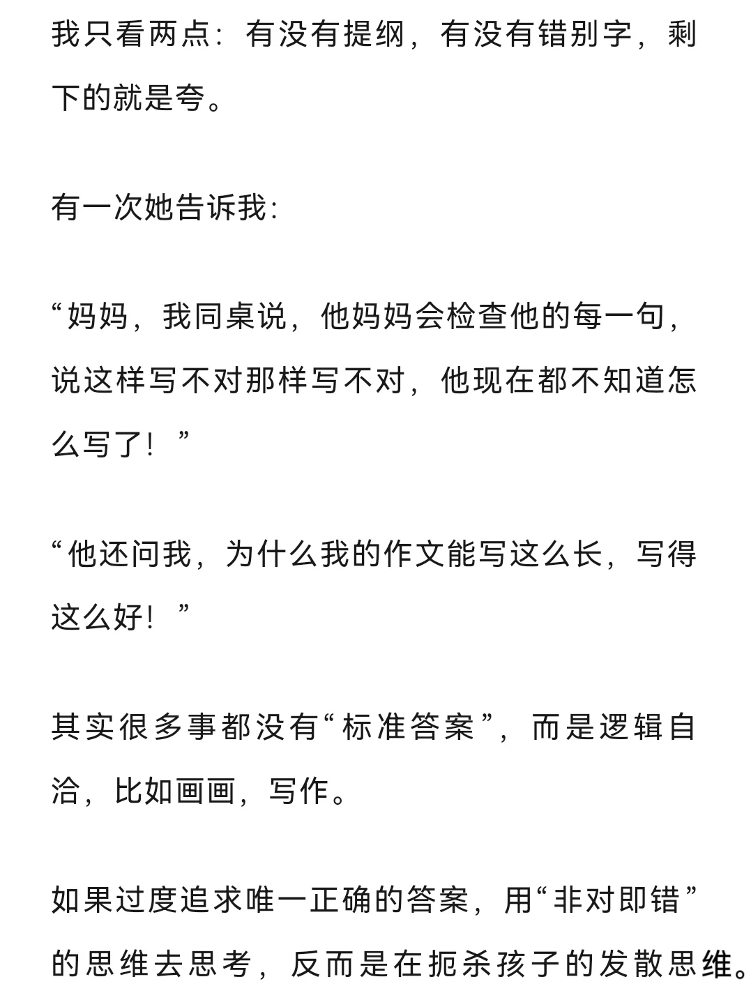 你有没有发现:曾经精灵古怪的孩子,好像变得死气沉沉,对什么都没了兴趣?看过一本书里写到:当孩子进入学校,就被推着向老师和家长预期的“榜样”靠拢,稍有偏差就会产生焦虑,最后彻底丢了自己本来的样子。我们一边抱怨孩子缺乏想象力和创造力,一边继续剥夺他们最珍贵的灵气。也许,正是我们日复一日的“教育”,剥夺了孩子尝试和探索的勇气。 我们憧憬着孩子的美好未来,却又很容易在无形中偷走他们创造的能力。好的教育,不是从不走弯路,而是陪着孩子在试错中成长得更扎实。