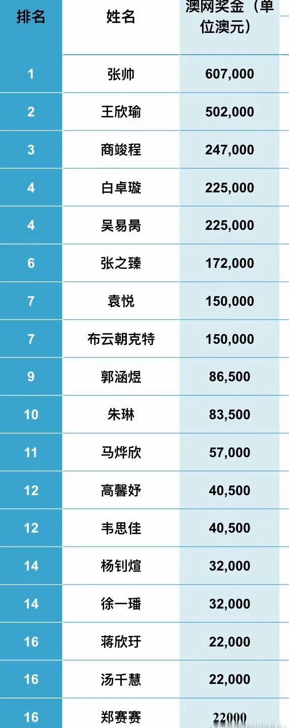 中国球员2026澳网奖金榜,张帅三线出击奖金最高,单打15万+女双45万+混双7000=607000澳元 王欣瑜单打16强+女双第三轮=502000澳元。