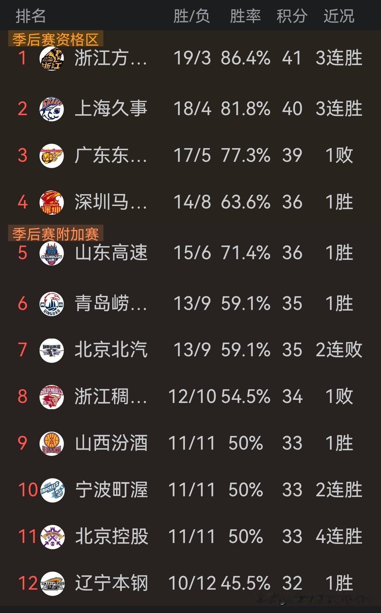 CBA常规赛第22轮战罢,宁波町渥11胜11负,胜率50%,积33分,20队中暂排积分榜第十,极有可能打入季后赛,加油! 宁波町渥胜的十一场有:四川丰谷酒业、江苏肯帝亚、南京天之蓝,深圳马可波罗,两胜浙江稠州金租、山西汾酒股份、天津先行者、青岛崂山啤酒、辽宁本钢、广东东阳光。这其中不乏有广东、青岛、山西、深圳和浙江稠州金租这样的强队。 而上赛季CBA常规赛,宁波町渥战绩仅为10胜36负, 20支球队中排名第十七。本赛季与往对比,进步非常明显,令人刮目相看,已然是一支很有竞争力的球队。 预祝宁波町渥取得好成绩!力争打入季后赛![点亮平安灯][点亮平安灯][点亮平安灯] CBA联赛排名