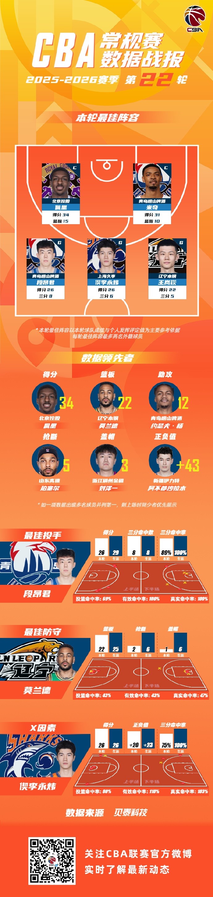 2025-2026赛季CBA联赛常规赛第22轮结束较量,来自北京控股篮球俱乐部的佩里,上海久事大鲨鱼的偰李永炜,辽宁沈阳三生飞豹篮球俱乐部的王岚嵚,青岛国信海天篮球俱乐部的米奇和段昂君入选CBA联赛常规赛第22轮最佳阵容!