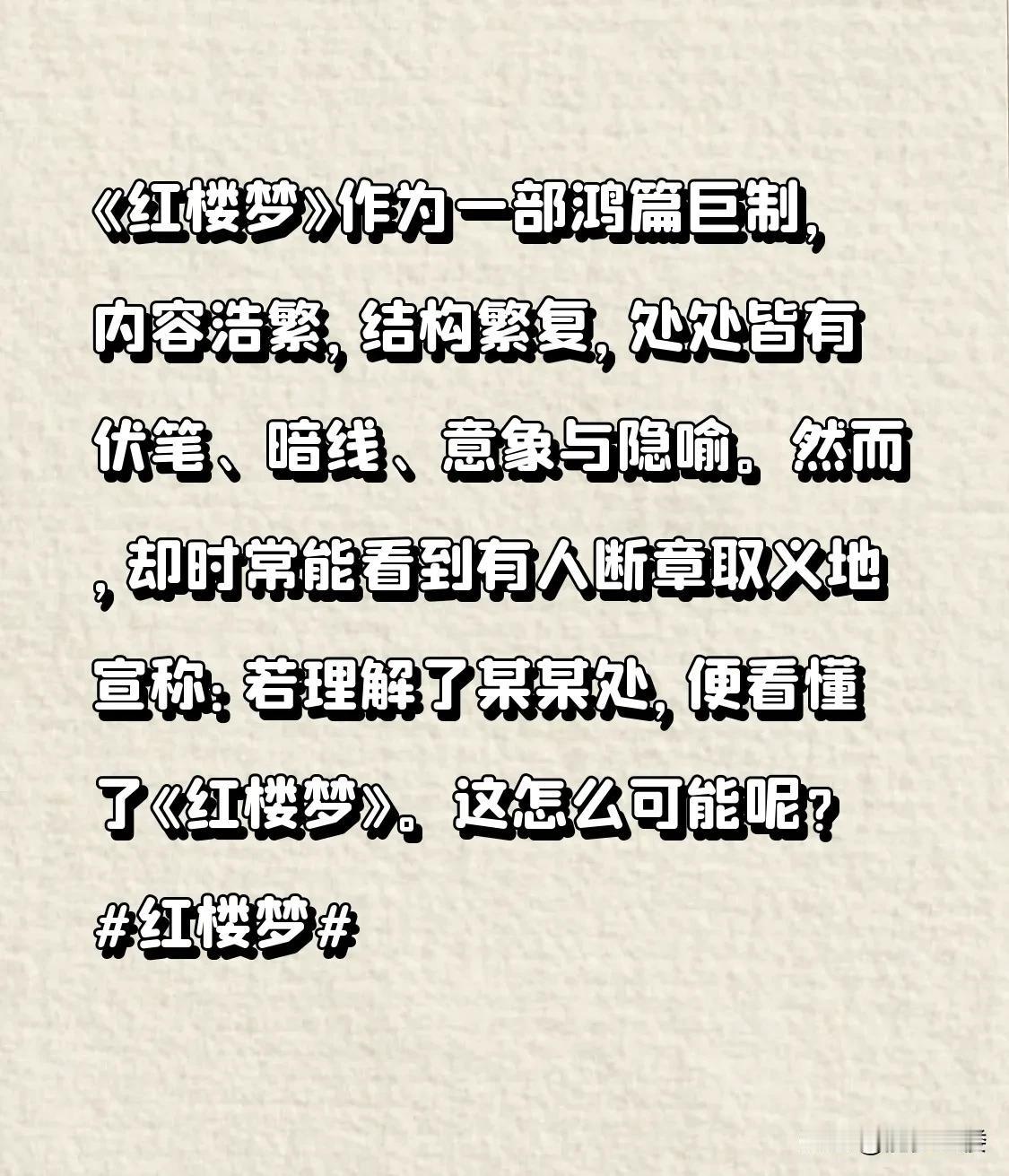 《红楼梦》作为一部鸿篇巨制,内容浩繁,结构繁复,处处皆有伏笔、暗线、意象与隐喻。然而,却时常能看到有人断章取义地宣称:若理解了某某处,便看懂了《红楼梦》。 这怎么可能呢?红楼梦红楼梦解读 87版红楼梦