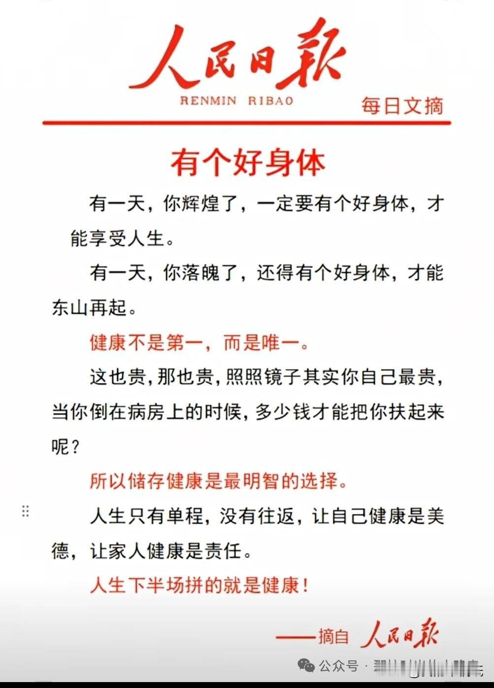 明白吗?当一个人躺在病床上,才会真正明白:这世间最昂贵的,是健康。它无法用财富交换,亦无法靠金钱赎回。 拥有健康,便拥有了最宝贵的资本;一旦失去,再多的荣华富贵也会顷刻归零。病弱之躯,承载不起任何物质的重量。 所以,身体是灵魂的圣殿,锻炼便是我们每日虔诚的礼拜。守护好自己的身体,才是人生最值得的投资。