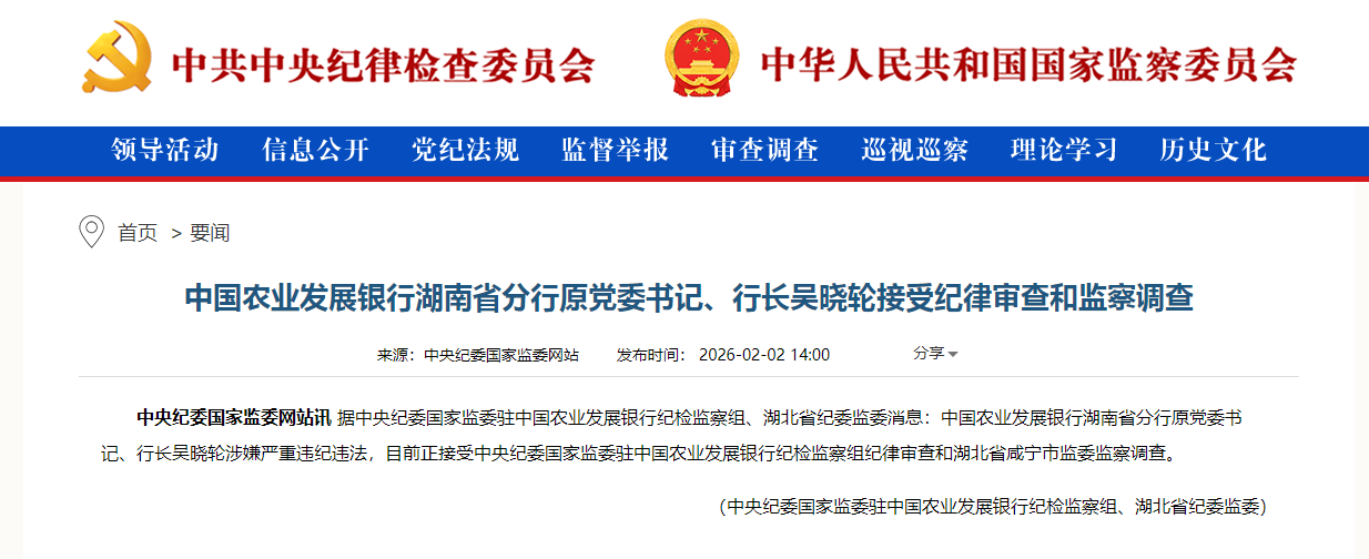中央纪委国家监委网站讯据中央纪委国家监委驻中国农业发展银行纪检监察组、湖北省纪委监委消息:中国农业发展银行湖南省分行原党委书记、行长吴晓轮涉嫌严重违纪违法,目前正接受中央纪委国家监委驻中国农业发展银行纪检监察组纪律审查和湖北省咸宁市监委监察调查。