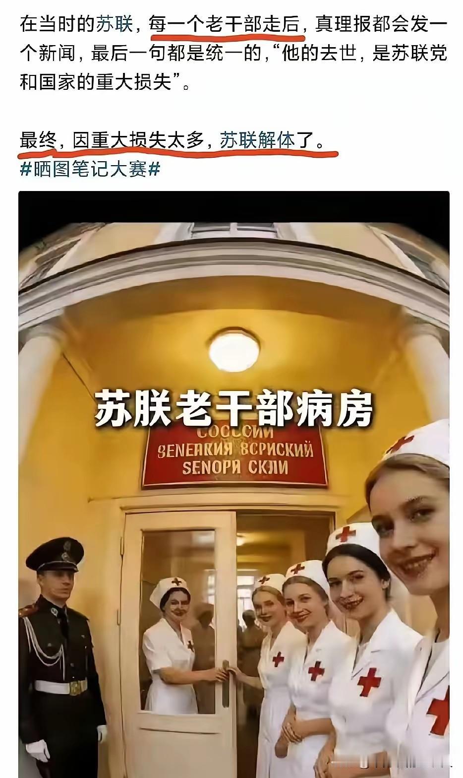 当年,苏联《真理报》为老干部撰写讣告时,结尾总有一句固定表述——“他的离世,是苏联党和国家的重大损失”。 的确如此,若每位干部的去世都堪称重大损失,那么从1922年苏联成立直至最终解体,近八十年间,无数老干部离世,损失着实巨大,能撑到1991年已实属不易。
