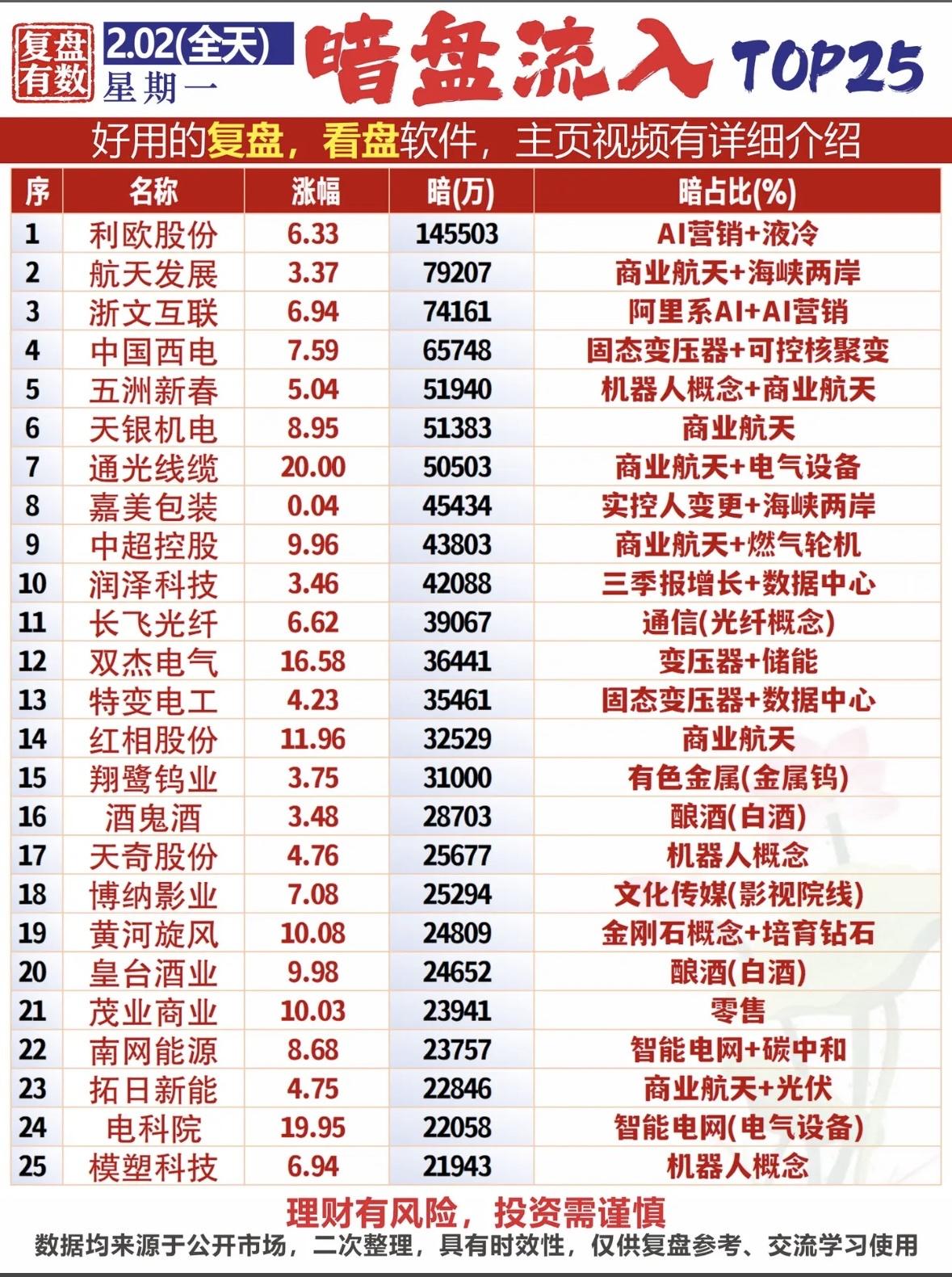 揭秘2.02日暗盘流入榜,发现隐藏的投资机会!📈💰 "暗盘流入热点:商业航天、AI营销、固态变压器领涨,机器人、储能跟风,数据仅供复盘交流。"