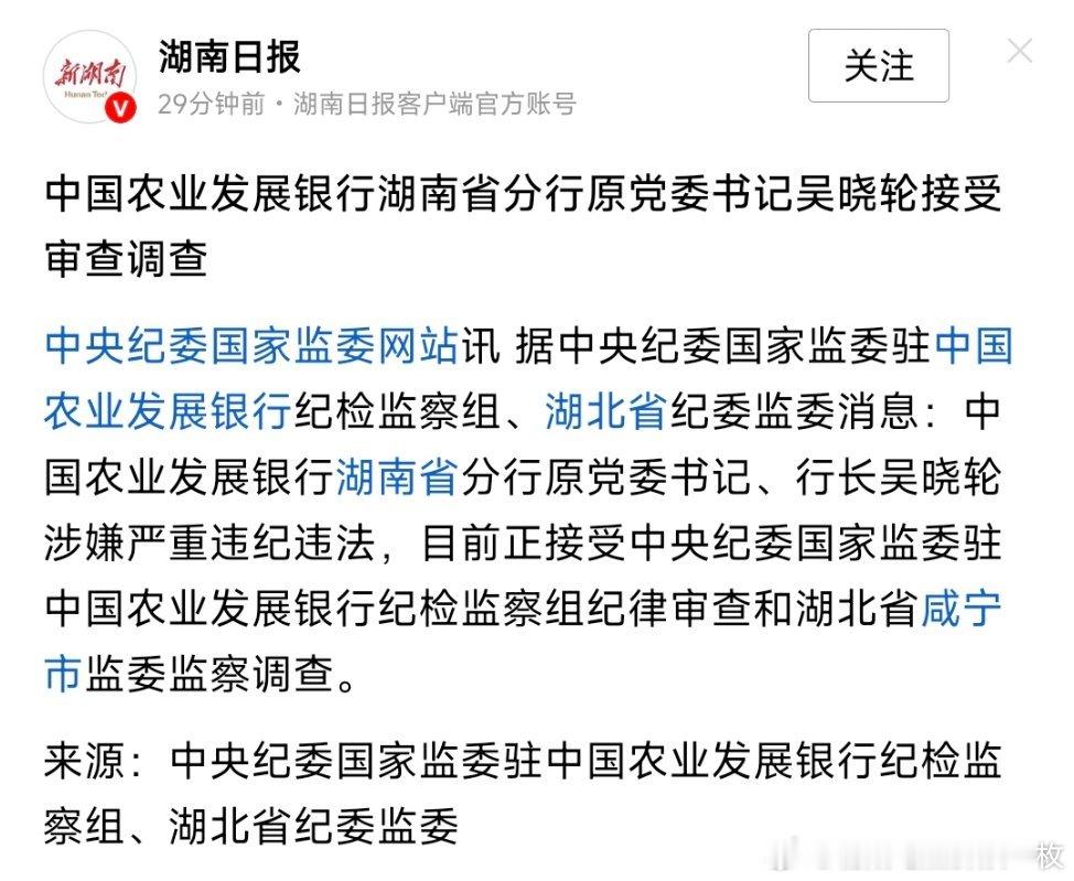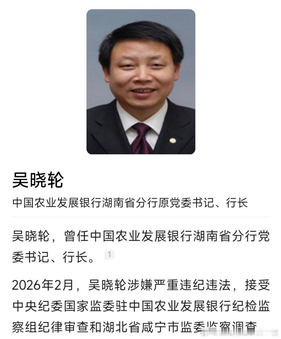 中国农业发展银行湖南省分行原党委书记吴晓轮接受审查调查,曾因违规放贷被撤职。