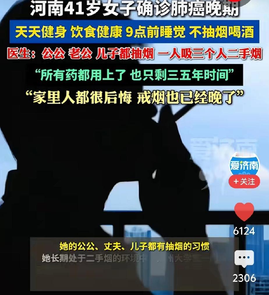 爱健身,作息规律,饮食健康的年轻女子,诊断肺癌晚期,真是疾病来时不会与任何人打招呼。 最近,河南一41岁女子突然被诊断为肺癌晚期,犹如晴天霹雳,让人措手不及。 更让人不能接受的是,该女子平时生活很自律,不抽烟不喝酒,天天健身,饮食健康,晚上睡觉从不超过9点。这么注重健康的一个人,竟然得了肺癌,并且是晚期,让人难以接受。 到底是什么原因,使这么注重健康的女子得了肺癌?医生初步断定为是吸二手烟所致,因为女子的公公、老公、儿子都吸烟。家人们对此都感到很后悔。 但是,广大网民对此说法大不赞同,有人说是可能因为厨房的油烟所致。对于经常做饭的女同志,厨房油烟确实对身体有一定的损害。但也不能就认定是做饭吸食的油烟所致,如果是这样,那么有人说了,厨师的肺癌的率更高,但是厨师的肺癌率也没有居高啊! 还有人猜测是女子化妆的问题,身上整天整化妆品或香水什么的,化妆品大多是化工产品,一天天的闻气味,也有可能引起肺癌。 还有人说,如果家人都不吸烟,那就得是另一个版本。得病与吸烟没有直接关系,可能与基因有关系。 真说不准,有的人吸一辈子烟,到死都没得病,还有的人一辈子都没有闻到过烟味,最后却得了肺癌,这也确实很难说。得病的诱因有很多,也跟不同的人的体质有关。 图片来自网络侵删致歉