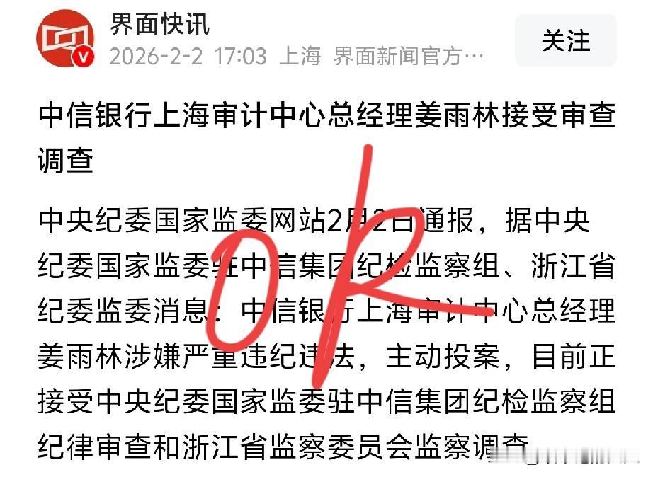 哦豁!被逮住了?! 年薪400多万的银行行长姜雨林没有失联,这不,就在刚刚,我看“界面快讯”新闻说被查了,其实,就在上个月还被爆他失联呢。 天网恢恢,疏而不漏。这么来看,他能失联到哪里呢?他今年才58岁,还没有到退休年龄,虽然他很有钱,但是我认为在反腐形势这么大的情况下,他想跑也跑不了,想躲也躲不掉。 看了一下,他常年在金融系统工作,在浙商银行,中信银行还有其他单位都担任过领导职务! 今天被查也算是尘埃落定。马上就要过年了,接下来他的日子可能不好过了。 在我看来,拿着这么高的工资。吃啥买不到,喝啥买不到呢?就是买套房子也绰绰有余吧,非要去违规违纪不考虑后果,确实是不应该啊!值得惊醒!
