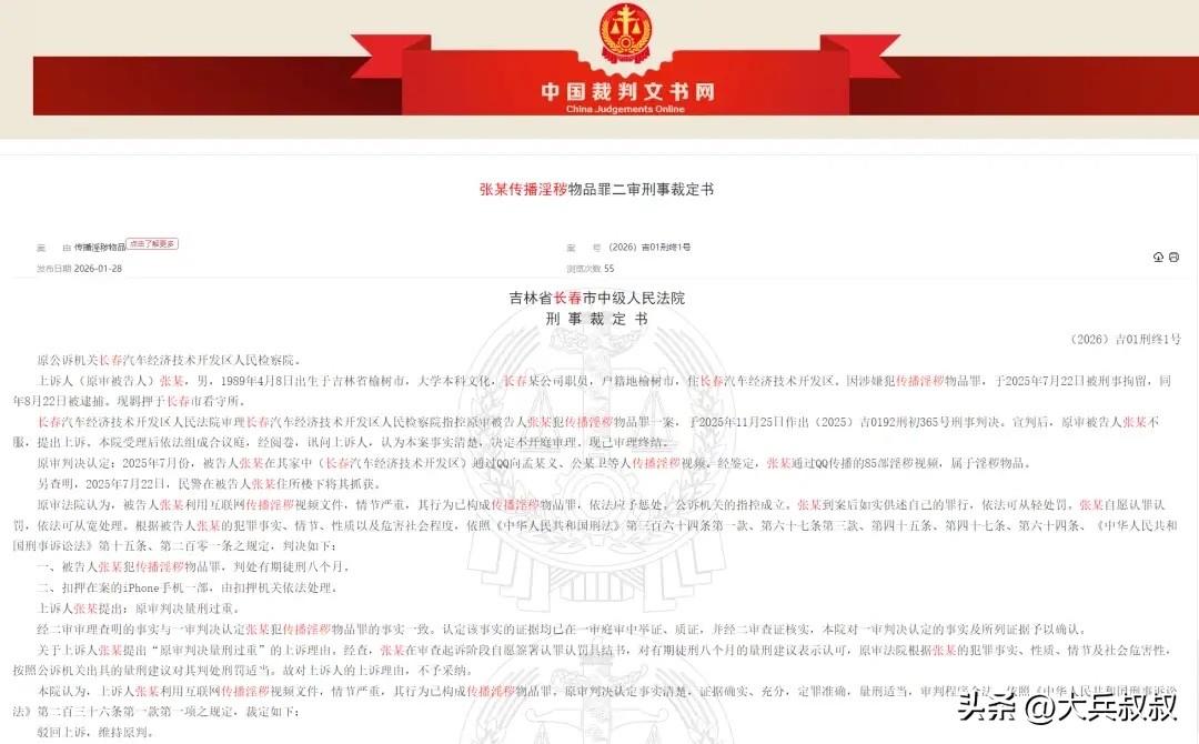 吉林长春,一36岁男子闲来无事,于是便给QQ好友发送一些小视频,结果却被通讯录好友举报,男子最终被处以了有期徒刑8个月,男子质疑,自己只不过是给朋友传了几个小视频而已,能有多严重?于是,男子提出了上诉。 据悉,男子张某出生于1989年,大学毕业后,就入职了一家公司,在2025年7月的时候,张某在家中通过QQ给好友传了不少小视频,不知道是哪位好友热心,直接将张某给举报了。 几天后,民警将张某抓获归案,经过调查,张某一共给好友转了85部小视频都被认定为了不雅视频,而张某也因传播淫秽物品罪被刑事拘留。 此后,一审法院做出判决,以张某构成传播淫秽物品罪为由,判处其有期徒刑8个月,张某对此并不服气,张某认为,自己只不过是传播了几个视频而已,又不是小偷小摸,怎么能处罚的如此严厉呢,于是,张某便提起了二审。 事发后,网友则调侃,如果张某把这85部制作成了一部,那还违法吗?还有网友则调侃起来,视频安全还是食品安全?当然,也有网友表示,如果我发给我媳妇看,那违法吗? 其实,不管是转给谁,只要是转发了,就是违法行为,只不过根据转发的数量不同,最终承担的责任也不同。 一般而言,以盈利为目的的传播这样的视频是违法甚至是犯罪行为,只是给好友看,又不是赚钱,怎么也违法了? 其实,按照相关的司法解释的规定,以盈利为目的的传播,只要传播了20个以上的,就属于犯罪行为,而如果是传播40个以上的,无论有没有盈利,都是传播淫秽物品罪,按照刑法的规定,传播淫秽影片情节严重的,处二年以下有期徒刑、拘役或者管制。 所以,判处张某有期徒刑8个月,也是符合上述法律规定的。 有人问,如果我给好友传了一个小视频,是不是就不是犯罪了?其实确实不是犯罪行为,但是是违反治安管理处罚法的违法行为,按照其第八十条规定,制作、运输、复制、出售、出租淫秽的书刊、图片、影片、音像制品等淫秽物品或者利用信息网络、电话以及其他通讯工具传播淫秽信息的,处10日以上15日以下拘留,可以并处5000元以下罚款;情节较轻的,处5日以下拘留或者1000元以上3000元以下罚款。 所以,只要存在上述一种行为,复制也好,制作也罢,都要面临着最高15日行政拘留以及罚款5000元的处罚,即这里并没有区分是不是家人、朋友,也就是说,向这些朋友、家人传播的行为,也属于违法行为,也要面临行政处罚。 当然,回到这起案件本身,张某只是因为给好友传了几个小视频,最终入狱服刑不说,工作也保不住了,就算8个月刑满释放之后,想要再找到一份之前的工作,就难上加难了,不知道张某有没有后悔过,当初就不应该给好友发小视频。 对此,你对本案有什么看法? —————————— 关注我,带你评析法律热点,关注冷暖人生。 文章原创,抄袭必究
