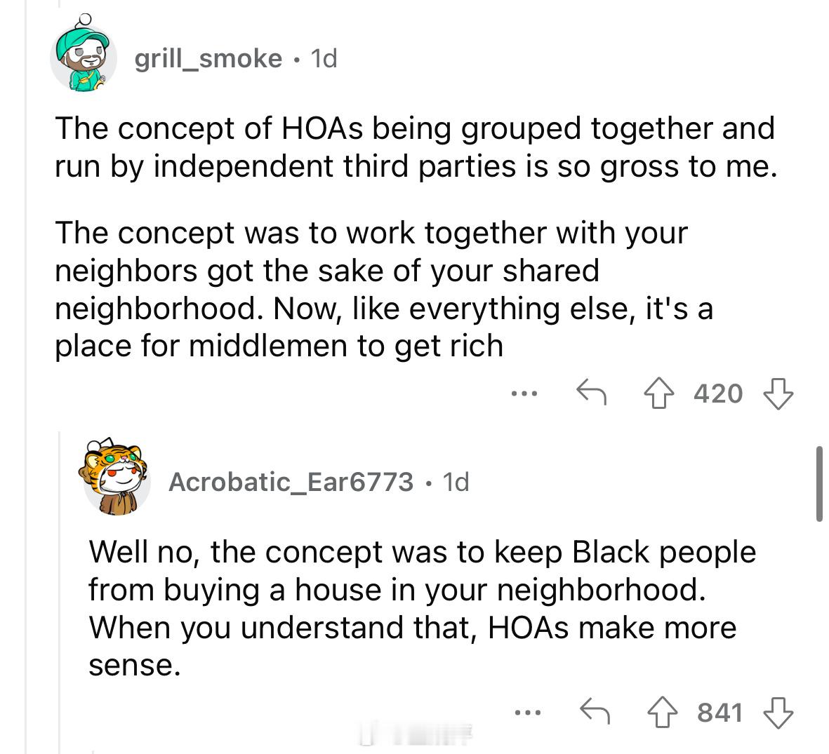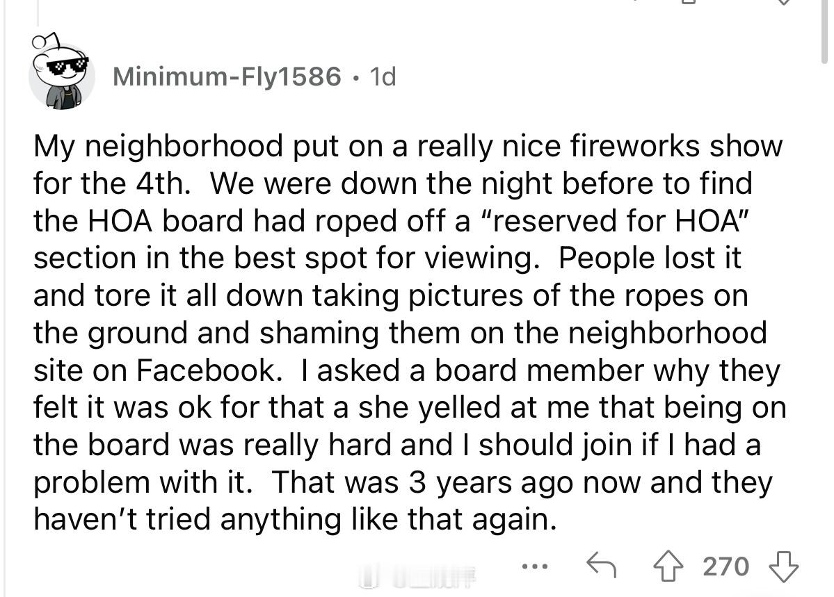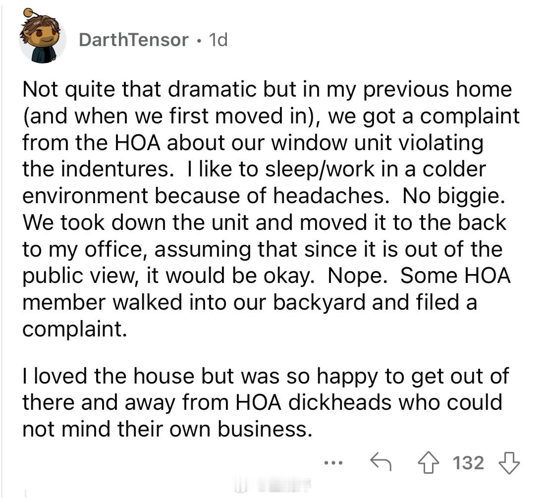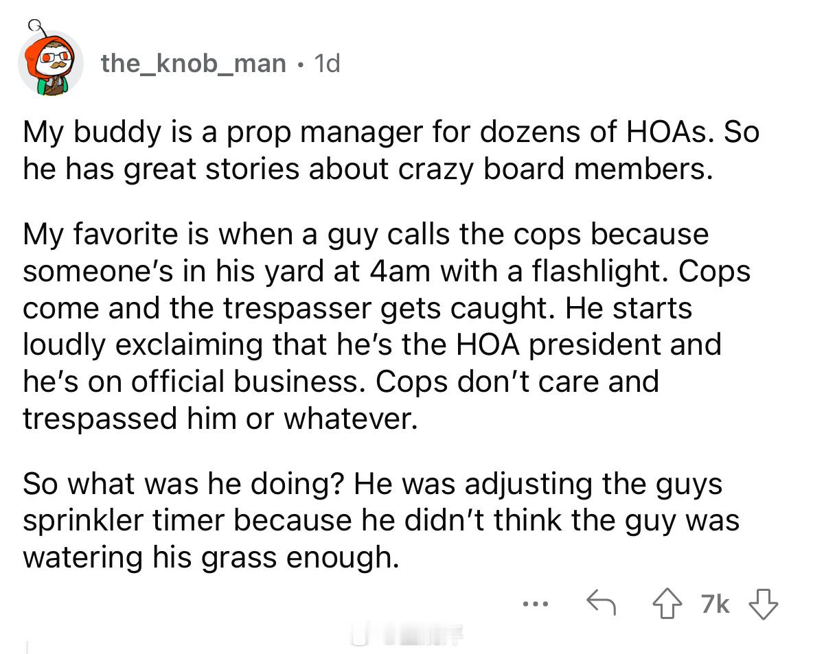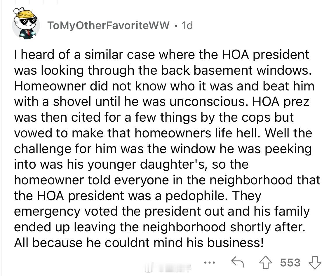 🔴“我的朋友当过几十个业主协会的物业经理。所以他有很多关于傻x协会成员的精彩故事。我最喜欢的故事是,有人凌晨4点拿着手电筒在他家院子里,他就报警了。警察来了,闯入者被抓了,然后开始大声喊叫说他是业主协会主席,是来执行公务的。但警察根本不在乎,还是给他开了个擅闯民宅什么的罚单。那人当时在干什么呢?他在偷偷调整那户人家的洒水定时器,因为他觉得那户人家草坪浇得不够。”🔴“虽然事情没那么戏剧化,但我之前住的房子(在我们刚搬进去的时候),我收到了业主协会的投诉函,说我们的空调窗机违反了美观协议。我喜欢在比较冷的环境下睡觉/工作,因为我会犯头疼。但这没什么大不了的。我们把空调拆下来,搬到了屋子后面的房间,以为既然不在临街的公共视线范围内,应该就没问题了。结果并非如此。某个业主协会成员偷偷走进了我们的后院,然后又提出了投诉函。我很喜欢那栋房子,但很高兴能离开那里,远离那些管不住自己事的业主协会混蛋。”🔴“我听说过一个类似的案例,一个业主协会主席正在透过后地下室的窗户偷窥别人家里情况。 房主不知道他是谁,就用铲子把他打到昏迷。之后,业主协会主席因为这些事情被警察传讯,但他发誓要让房主的生活变成地狱。然而,对他来说麻烦的是,他偷窥的窗户是房主小女儿的,所以房主告诉了社区里的所有人,业主协会主席是个恋童癖。人们紧急投票罢免了他,他的家人不久后就离开了社区。 这一切都因为他管不住自己的事”🔴“我的社区在7月4日举办了一场非常精彩的烟花表演。但前一天晚上我们下去的时候发现,业主协会在最佳观赏位置用绳子围出了一块“业主协会保留”的区域。人们都气疯了,把绳子全部扯了下来,并在社媒网站上曝光了他们的行为。我问一位会成员为什么他们觉得可以这样做,她冲我大喊,说当协会成员很辛苦,如果我对此有意见,就应该加入业主协会。那是3年前的事了,他们再也没有尝试过类似的事情。”🔴“业主协会由独立第三方联合运营,这种概念让我感到恶心。 最初的想法是与邻居们为了共同的美好社区理念而合作。现在,和其他所有事情一样,它成了中间商发财的地方。”“不,最初的理念只是为了阻止黑人在你的社区买房。当你理解了这一点,业主协会就更有意义了。”