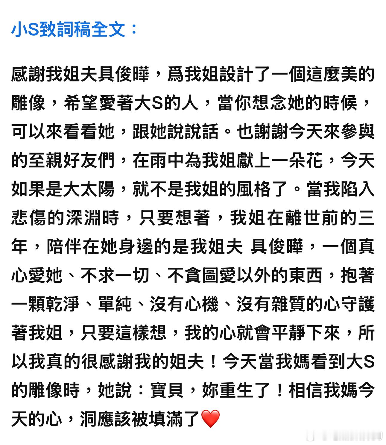 台媒披露了小S今天下午的发言全文,希望爱着大S的人如果想念她,可以来金宝山看看她,跟她说说话。也特别感谢了姐夫具俊晔,设计了这样一个雕像,并让大S在离世前三年体会到了最纯真的、不掺任何杂质的爱。小S主持数度泪崩