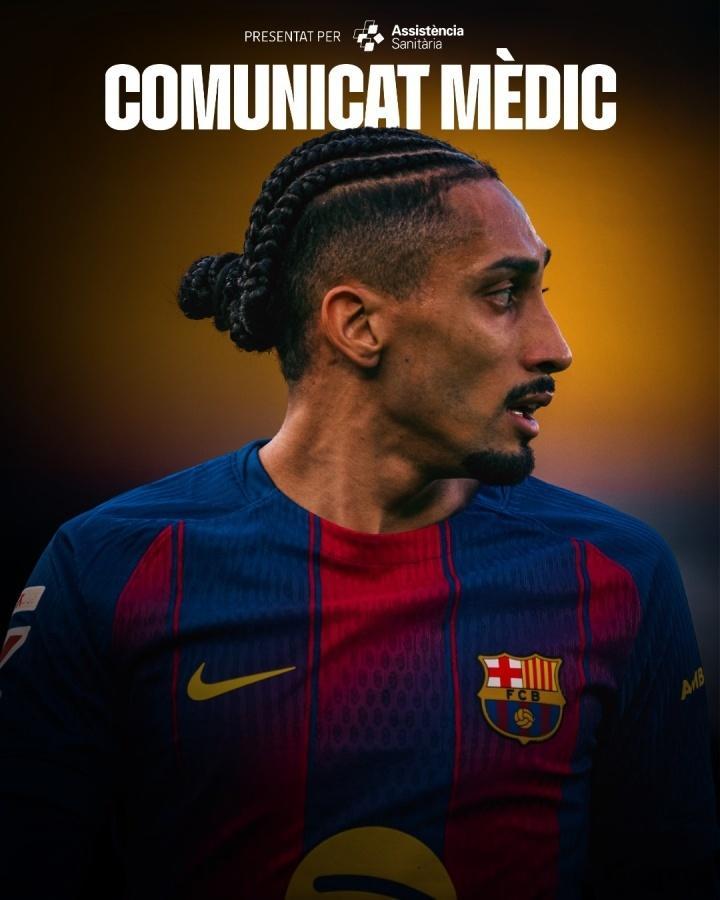 巴萨官方宣布,拉菲尼亚右腿内收肌群出现超负荷伤情,出于预防,他将缺席周中国王杯对阵阿尔瓦塞特的比赛,预计恢复期为一周。
