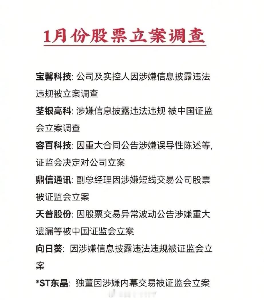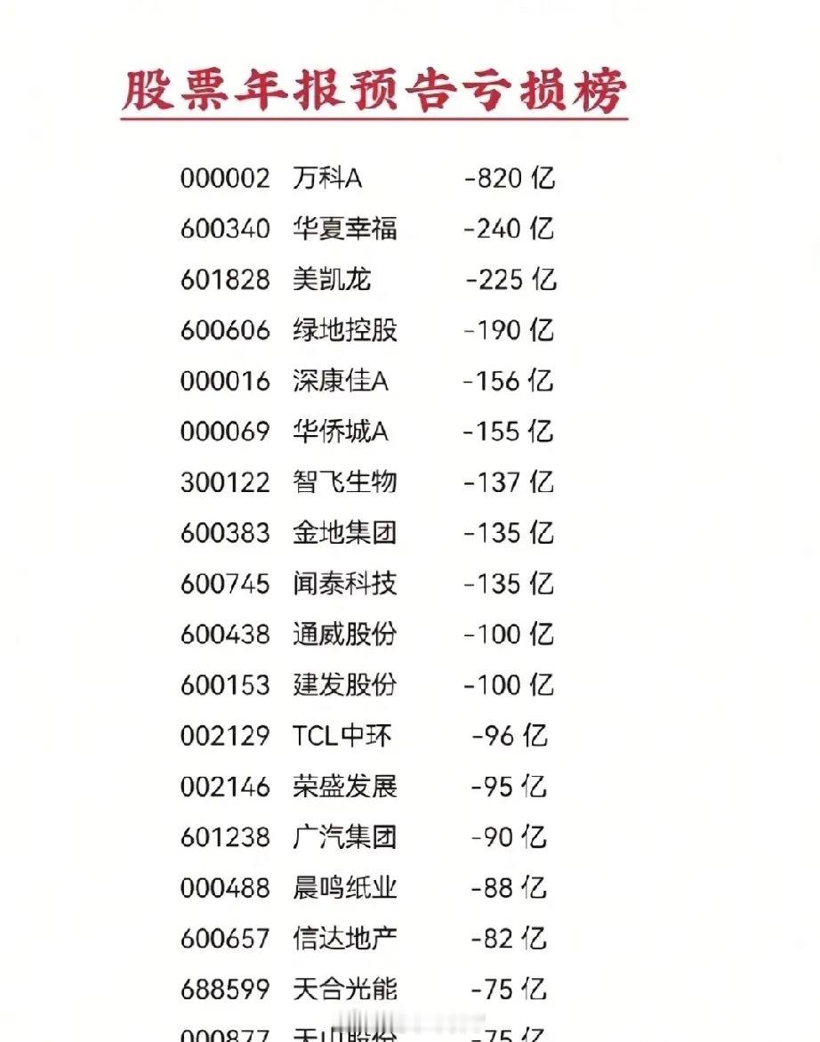 注意避雷,2025年退市名单、一月份立案调查股、年报预亏榜、财务风险股全曝光!年报预告巨额亏损、资不抵债的风险个股代表:华夏幸福、深康佳、易华录、湘邮科技等等。(央国企业绩堪忧的公司真不少!)2026开年第一个月被立案调查的公司有天普股份、宝馨科技、容百科技等等。立案调查的公司最好敬而远之,去年就有30多家问题股被退市,真的不得不防!理财有风险入市需谨慎啊…~这些风险股堪称“财富粉碎机”,持仓的朋友务必紧急排查,及时规避踩雷,保住本金才是王道!投资路上不踩坑,快转发给身边股友一起避险!