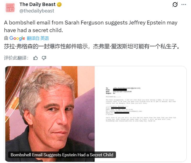 美媒:2011 年,就在爱泼斯坦出狱不久,前约克公爵夫人曾写信给他,信中称有人告诉爱泼斯坦已有了一个“男婴”孩子。 她说,她是从她的前夫、“公爵先生”安德鲁那里得知这一消息的。尽管两人此前已失去联系,但她还是通过即时通讯软件与爱泼斯坦取得了联系。 “不知道你是否还在使用这个 BBM 聊天工具,但从杜克那里得知你已经生了个男宝宝。尽管你们从未保持过联系,但我依然带着爱、友情以及对你的喜讯(恭喜你有了宝宝)而在此向你表示祝贺。萨拉 xx”,她在大约 14 年前的 2011 年 9 月 21 日所发的这条消息中这样写道。 尽管这封电子邮件暗示爱泼斯坦有一个儿子,但从未有证据证明他确实有过子女。在他死前,他从未承认有过后代,然而此后有超过 100 人声称自己是他的子女,并试图分割他的遗产。