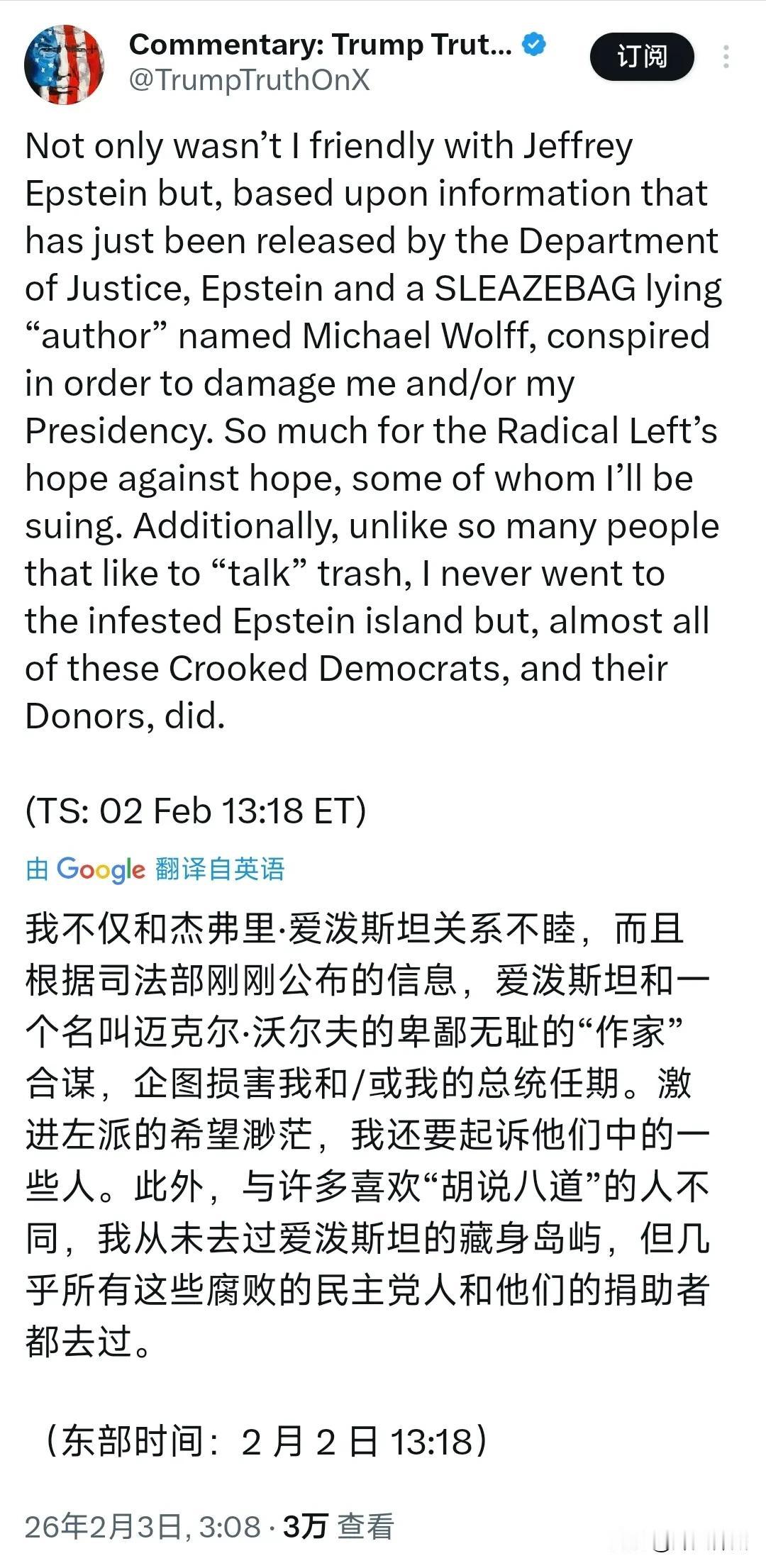 特朗普表示自己没去过爱泼斯坦的肮脏岛屿!特朗普今天(北京时间2月3日)发文写道:“我不仅和杰弗里·爱泼斯坦关系不好,而且根据司法部刚刚公布的信息,爱泼斯坦和一个名叫迈克尔·沃尔夫的卑鄙无耻的‘作家’合谋,企图损害我和/或我的总统任期。激进左派的希望渺茫,我还要起诉他们中的一些人。此外,与许多喜欢‘胡说八道’的人不同,我从未去过爱泼斯坦的藏身岛屿,但几乎所有这些腐败的民主党人和他们的捐助者都去过。” 评几句: 特朗普发文怒辩未踏足爱泼斯坦的私人岛屿,还痛批对方与作家合谋构陷自己,反手将所有黑锅甩向民主党,这番气急败坏的自白,哪里是自证清白,分明是欲盖弥彰的甩锅大戏! 口口声声说与爱泼斯坦关系恶劣,却对二人过往的密切交集绝口不提; 坚称自己从未登岛,转头就把所有民主党人拉出来背锅,用政治对立转移视线的套路,未免太过拙劣。 更可笑的是,一边拿着司法部的信息控诉被构陷,一边却刻意回避档案中关于自己的关键细节,只挑对自己有利的话讲。嘴上喊着要起诉追责,实则全程避重就轻,用情绪化的指责代替实际的证据自证。 说到底,真正的清白从不需要靠抹黑他人来证明,特朗普这般急着甩锅、刻意回避的操作,只会让人疑窦丛生。靠抹黑甩锅的“自证清白”,不过是自欺欺人的闹剧罢了,谁会真的信?