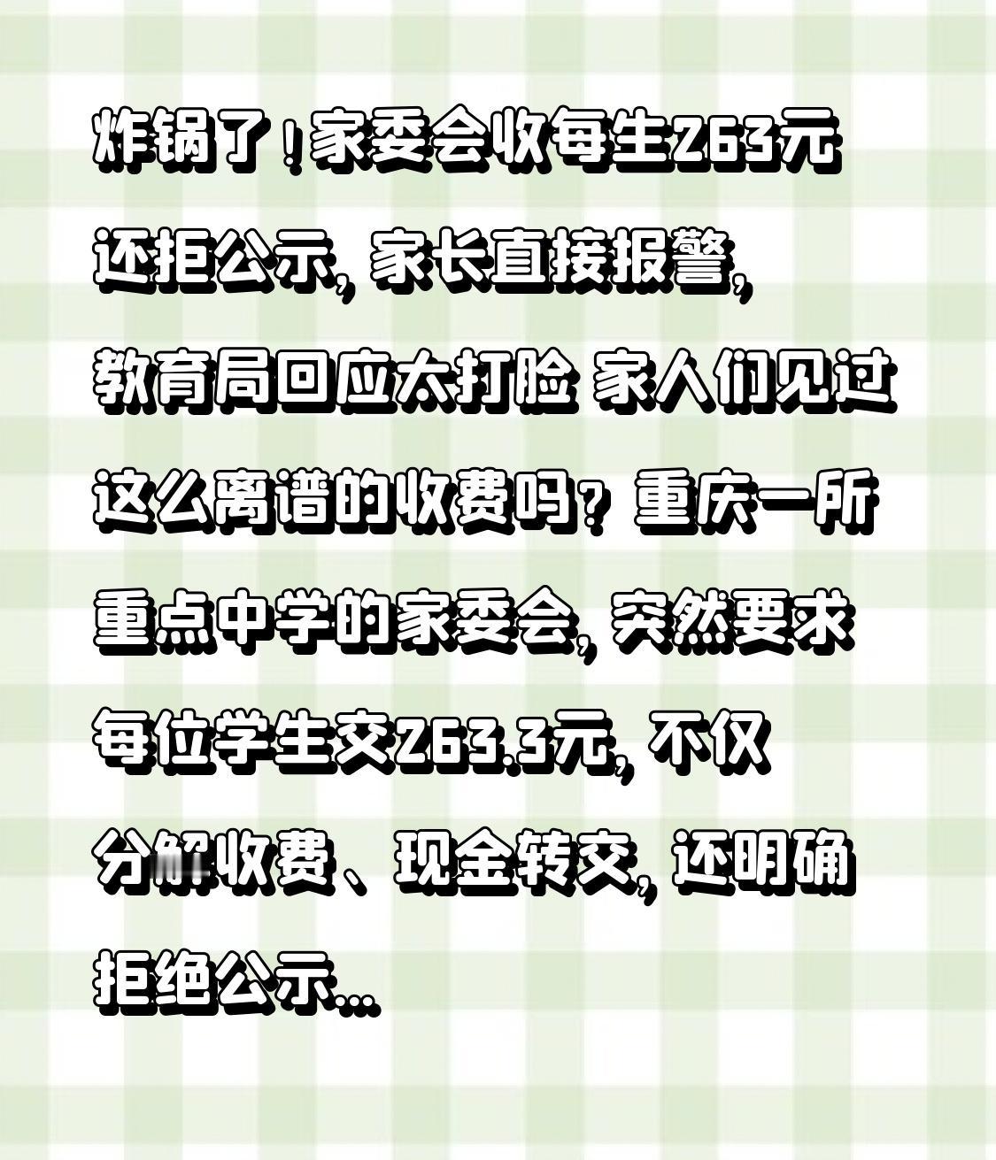 炸锅了!家委会收每生263元还拒公示,家长直接报警,教育局回应太打脸 家人们见过这么离谱的收费吗?重庆一所重点中学的家委会,突然要求每位学生交263.3元,不仅分解收费、现金转交,还明确拒绝公示明细,说“家委会内部知道就行”,一位家长质疑无果后直接报警,这事直接把“家委会收费乱象”推上热搜! 事情发生在重庆巴蜀科学城中学校,初一年级某班开学不久就成立了家委会,可没想到才几个月,就出了幺蛾子。家委会负责人突然通知,要收一笔263.3元的费用,包含国防教育费、资料费、寒假大礼包等5个项目,还要求家委会成员分摊收费——每人负责收5名家长的钱,汇总后换成现金交给班主任,全程不准做电子表格,更不能在家长群公示明细。 有家长当场质疑:“以前都是财务统一收,还会公示明细,这次为啥要偷偷摸摸?”结果负责人一句话怼回来:“学校要求的,避免产生矛盾,每个班都这么做!”可当家长追问收费是否合规时,对方却支支吾吾说不出个所以然。更让人膈应的是,这已经不是第一次了,之前教师节家委会还想强制摊派500元买礼物,就因为有家长反对,才勉强扣除了50元。 本以为是学校授权的正规收费,没想到第一个转折点来了!质疑的家长多次联系班主任核实,对方始终不正面回应,无奈之下只能报警求助。更打脸的是,辖区教育局直接明确回应:“重庆范围内根本没有这些收费项目,涉及资料费必须学生自愿订购,学校不能统一收取!”一边是家委会说“学校要求”,一边是教育局说“没有相关项目”,班主任和学校还全程沉默,这波操作让网友炸了锅:“这分明是想搞暗箱操作!” 第二个反转更离谱,这收费流程全是违规操作!根据《教育收费公示制度》,收费项目、标准必须公开透明,可涉事家委会偏要反着来:分解收费规避监督,现金转交抹去痕迹,拒绝公示剥夺家长知情权,一套操作下来,明摆着是心里有鬼。而且教育部早就明确说了,家委会的职责是搭建沟通桥梁,根本没有收费权限,现在反而成了违规收费的“工具人”,难怪家长要较真。 其实这事看似是263元的小事,实则戳中了所有家长的痛点。现在不少学校的家委会变了味,从家校沟通的桥梁,变成了摊派收费的“代名词”,今天收资料费,明天收慰问品费,动辄几百上千,还不让问、不让查,完全背离了成立的初衷。就像浙江早就明确规定,通过家委会违规收费要追究学校责任,可还是有人顶风作案。 这位家长的报警,根本不是小题大做,而是对教育乱收费的坚决说不!教育的纯粹性,容不得半点暗箱操作;家校之间的信任,也建立在公开透明的基础上。家委会不是“一言堂”,收费更不能“藏着掖着”,不管多少钱,都得说清楚、讲明白,让家长花得明明白白。 你遇到过家委会强制收费的情况吗?欢迎在评论区聊聊,点赞关注,一起呼吁让家委会回归本职,守护教育的公平与纯粹!