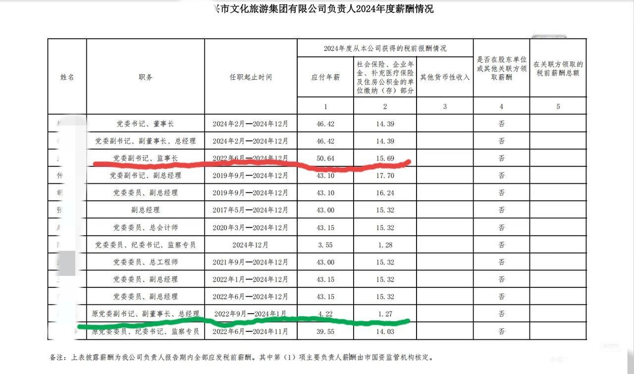 某地级市文旅集团主要负责人年度薪酬报表。 发现其中两个领导的薪酬标准是区别于其他