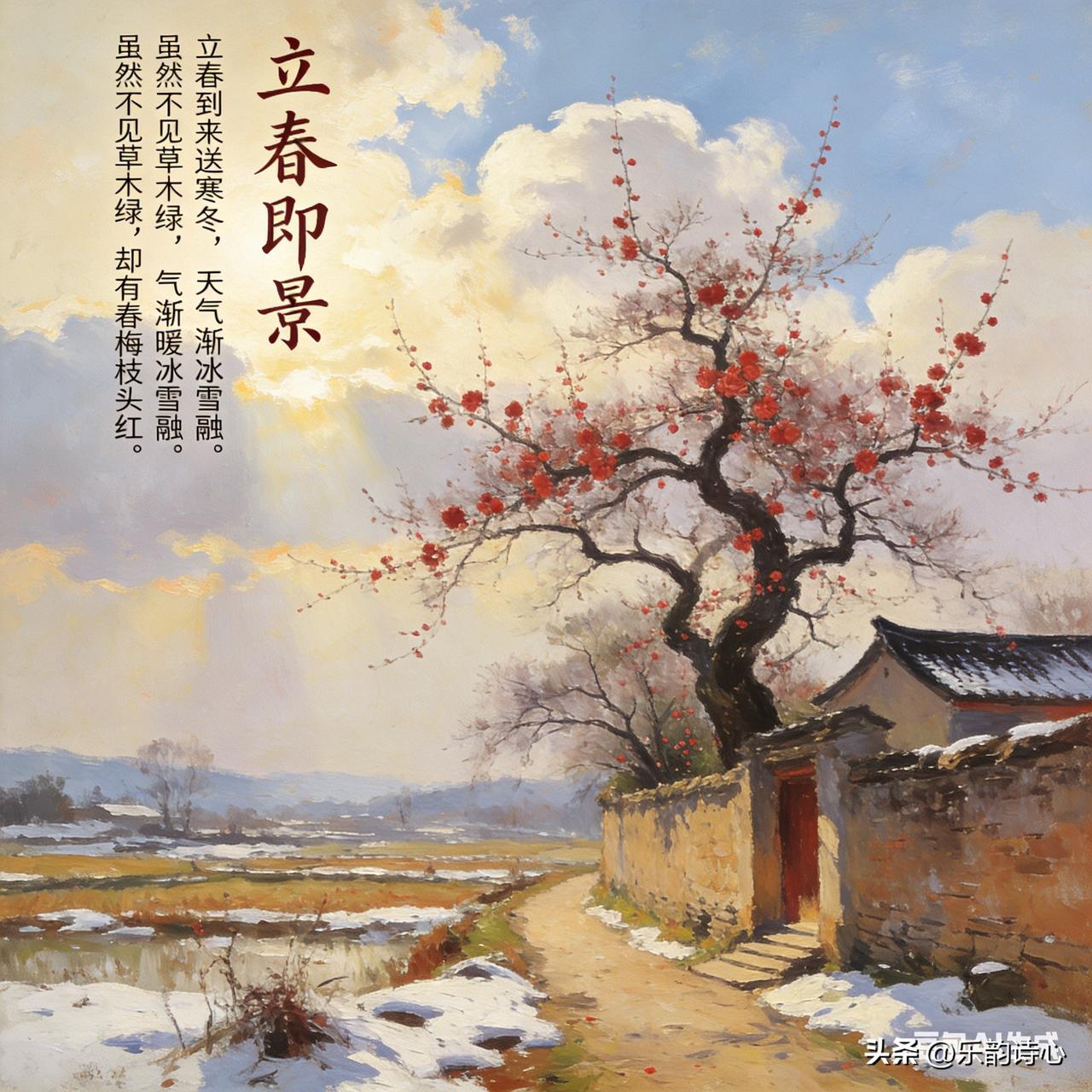 《立春即景》乐韵诗心原创诗词: 立春到来送寒冬, 天气渐暖冰雪融。 虽然不见草木绿, 却有春梅枝头红。 《立春即景》以时序更迭为脉络,展现早春独特生机:首句"送寒冬"点明立春标志,次句"冰雪融"以具象场景显气候回暖。后二句"不见草木绿"与"春梅枝头红"形成视觉对比,既如实描绘乍暖还寒时节的自然特征,又以春梅破寒绽放的意象,暗喻生命力的顽强与春的必然性。全诗通过"送-融-见-红"的动态链条,既呈现季节转换的渐进过程,又借春梅的鲜艳色彩传递对春日的期待,于素淡笔墨中见盎然诗意,尽显自然轮回中生命的坚韧与希望。
