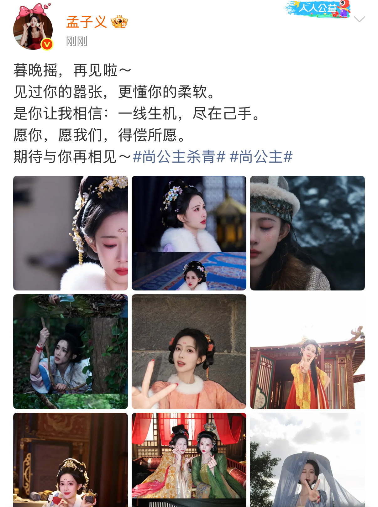 孟子义晒尚公主杀青九宫格孟子义尚公主杀青发博,并晒出九宫格,平行世界的暮晚摇要幸福呀,现实世界的孟姐也要一直幸福孟子义尚公主杀青发博尚公主今朝暂别