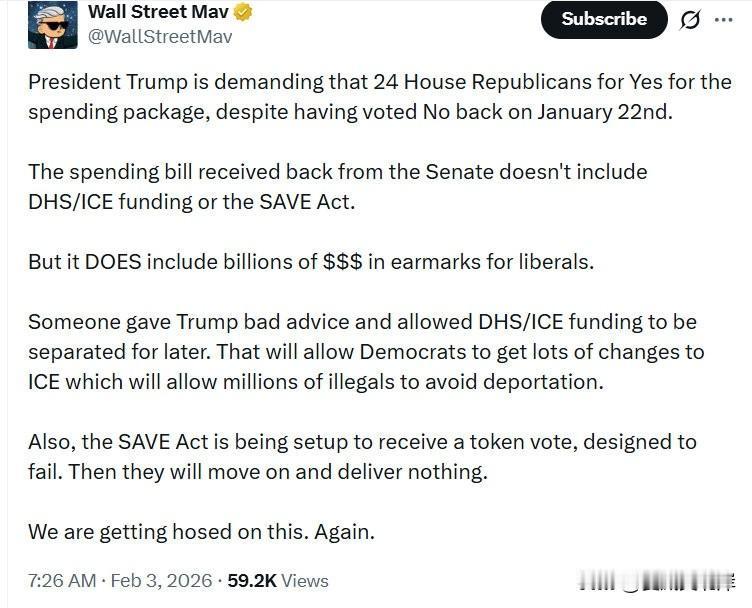 川普总统要求24名众议院共和党人对支出方案投赞成票,尽管他们在1月22日曾投反对票。 从参议院返回的支出法案不包括国土安全部/移民和海关执法局(DHS/ICE)的资金,也不包括SAVE法案。 但它确实包含了数十亿美元给自由派的专项拨款。 有人给川普出了馊主意,允许将DHS/ICE的资金留待以后单独处理。这将让民主党人对ICE进行大量改动,从而使数百万非法移民得以避免被驱逐。 此外,SAVE法案被安排进行一次象征性投票,注定会失败。然后他们就会继续推进,最终一事无成。 我们又被耍了。又一次。