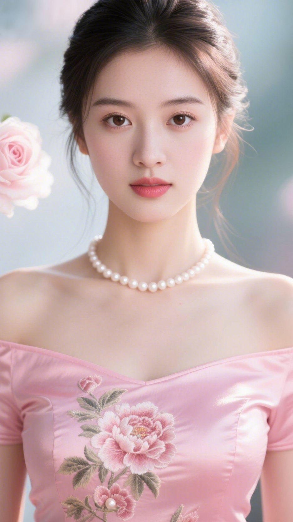 《粉衫映春柔》 软雾般的光里,粉衫绣纹裹着春的轻柔——缎面上的牡丹,像沾了晨露的花瓣,连针脚都浸着温软。露肩的剪裁带着恰好的舒展,颈间珍珠的润光,似揉碎的月光凝成细链,温和地衬着松弛的姿态。 旁侧的粉玫瑰轻晃,与裙上花影相融,连周遭气息都成了淡粉的软风。这不是刻意的妆点,是把春的柔织进了衣料:缎面的光泽裹着妥帖的暖,绣纹的细腻藏着不张扬的雅,像清晨推窗撞见的花雾,没有浓烈的香,却让人不自觉放轻了呼吸。 原来柔美的模样,从不是用力的精致,是这样把春的软意裹在身上,轻轻巧巧便漫开了生活的温。 粉衫柔春感 日常雅致穿搭