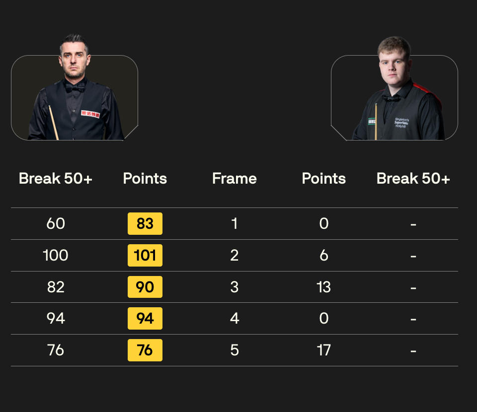 全场比赛,塞尔比打出一杆100分和四杆50+(60、82、94、76)。