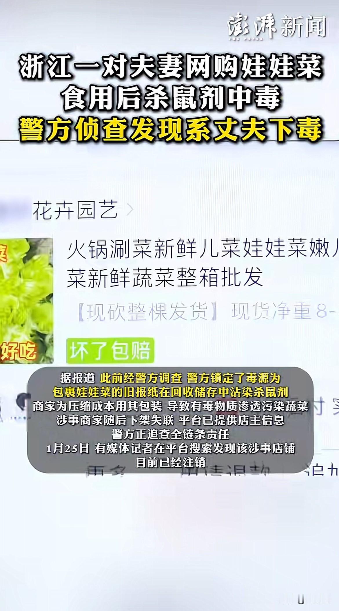 惊天反转!浙江台州,一夫妻吃了网购娃娃菜后杀鼠剂中毒进ICU,曾怀疑商家使用不合规旧报纸包装导致,没想到查出是丈夫下毒。 事件回顾:12月16日,杨女士夫妻俩吃了网购娃娃菜后双双进ICU,杨女士在ICU治疗一个月才好转,丈夫也出现肠道出血、胃出血,呼吸衰竭,住院治疗观察了很久。 医院诊断夫妻俩是杀鼠剂中毒,此前警方调查毒源为包裹娃娃菜的回收旧报纸沾染了杀鼠剂,大家都先入为主认为是商家使用包装不当导致,1月25日,商家注销了店铺。 2月3日,最新官方报道,警方侦查发现责任不在商家,下毒者是丈夫,目前已经被刑拘。这个结果真的万万没想到,丈夫为了谋害妻子,竟然自己也吃下被投毒都娃娃菜,太狠了。 此事最冤的就是涉事商家了,无辜受牵连,成了这对夫妻不幸婚姻的牺牲者,目前商家已关店并注销店铺,商家是否能起诉丈夫这个始作俑者,要求赔偿经济损失和精神损失费呢? 妻子应该也没怀疑过这个枕边人吧。真正让她寒心,朝夕相处、相互扶持的伴侣竟有一天成了索命人。 目前作案动机还在进一步调查。要是丈夫不满这段婚姻,大可以离婚,却选择这样极端的方法,害人也害己。 婚姻是两个人的事,需要双方磨合,互相包容和理解,才能永葆爱情的新鲜感。这事也给我们无数夫妻敲响警钟,在婚姻关系中,有问题要及时沟通,不要把怨恨埋在心里,否则矛盾积累多了,可能会成为压死骆驼的最后一根稻草,酿成悲剧。