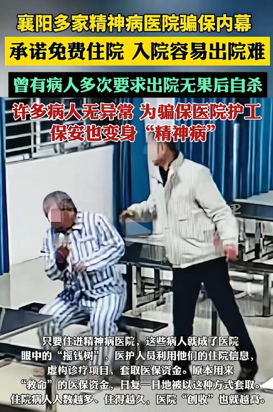 湖北襄阳,记者去某精神病院应聘护工,入职后,他发现了惊人内幕。医院承诺病人免费住院,但是住院容易出院难,好了也不让出院,有的病人受不了竟选择自杀。记者调查发现,一个市居然有20多家精神病院,医院早已违背了治病救人的初衷,反而是为了骗保。 老张在农村生活了一辈子,他正为儿子的病发愁。儿子有精神问题,家里经济困难,家里人一直不敢送医院。 正在老张纠结的时候,村里来了个自称是襄阳某精神病医院的人,让老张把儿子送他们医院,不仅免费住院,医药费、生活费全免,还能常年住。 一听这话,老张心动了,这简直是雪中送炭。 但他没想到,这个“免费”的承诺,背后藏着一个可怕的陷阱。 不只是该医院,老张打听了一圈,发现襄阳市里竟有二十多家精神病医院,许多都打着免费住院、免费接送的旗号。 这些医院像抢生意一样,甚至派人下乡找病人。老张觉得奇怪:怎么精神病院比牛肉面馆还多? 带着疑惑,记者老韩以应聘护工的名义,潜入了襄阳某精神病医院。 一进去,他就觉得不对劲,男病区里,三十多个病人,很多看起来挺正常,有的在打牌,有的在聊天。 一个护士悄悄告诉他:其实大部分都是轻症,好多是来戒酒的,还有不少老人,就是来养老的。 老韩看到,确实有七八十岁的老人,坐着轮椅,眼神浑浊。 更离谱的是,带他熟悉工作的那个男护工,自己居然也是个住院病人,原因是酒精引起的精神障碍。 护工悄悄告诉老韩:我没病,就是来上班的,医院让我办个住院手续,好套医保的钱。 事后,老韩又去了宜昌的另一家精神病医院,这里人更多,一个科室就挤了一百六十多人,大厅里都摆满了床。 情况和之前那家医院类似:住着许多老人,有些还是福利院送来的;两名保安也挂着住院病人的名头,平时自由出入,只有检查时才回病房。 记者从工作人员口中得知,年纪轻的可能是真有病,年纪大的,好多都是假的。 既然都是免费,那医院怎么赚钱呢?难道会做赔本的买卖不成? 老韩查了住院系统,发现了秘密。一个病人住90天,总费用一万多,其中项目名目繁多,什么心理治疗、行为矫正治疗。 可问了一圈病人,大家都摇头:根本没做过这些,就是每天吃药,跟在家一样。 原来,医院连CT设备都没有,每天给每个病人编造130块左右的治疗费,通过医保报销。 人住得越久,医院赚得就越多。要是一个人一个月套五千,一百个人一年就是六百万,这成本早回来了。 至于所谓的病人从哪儿来?医院有专门跑市场的员工,按名单下乡找,每拉来一个还有提成。 一旦进了医院,想出去就难了。 老韩看到每天都有新人进来,却几乎没人出去。进来前,医院说住45天就能走,到了时间又不让了。 医院严格控制病人和外界联系,一入院就没收手机。 有的病人一住就是八九年,甚至跟坐牢没区别。因为出不去,有的老人直接在医院去世。 2025年6月,医院里甚至发生了一起悲剧:一个因酗酒住院的病人,多次要求出院无果,最后不堪忍受,选择了自杀。 他生前在聊天里说,自己在医院被迫干很多活,打扫卫生、喂饭、给其他病人洗澡,只为了能换根烟抽。 医院的日子并不好过,男护工对不听话的病人抬手就打、抬脚就踹,甚至拿水管抽。 更讽刺的是,很多本应由护工干的活,例如刷碗、打扫、搬运物资、给其他病人洗澡喂饭,这些都交给了所谓工疗的病人去做,医院只给他们一点买烟的钱。 老韩还发现,为了应付医保检查,医院还会玩假出院的把戏:定期安排一批病人暂时离开,等检查过了再回来,就像躲猫猫一样。 调查到最后,老韩明白了,医院打着“免费”的旗号,把病人,甚至正常人,哄骗进来,当成套取医保资金的“摇钱树”。 他们虚构治疗项目,榨取医保基金,却几乎不提供真实有效的治疗。 为了钱,他们千方百计阻止病人出院,甚至不惜使用暴力与虐待。 原本应该治病救人的地方,变成了以利益为导向的牢笼。 这样一来,很多真正需要治疗的精神病人,因为害怕这样的地方,宁愿硬扛着,也不敢再迈进医院一步。