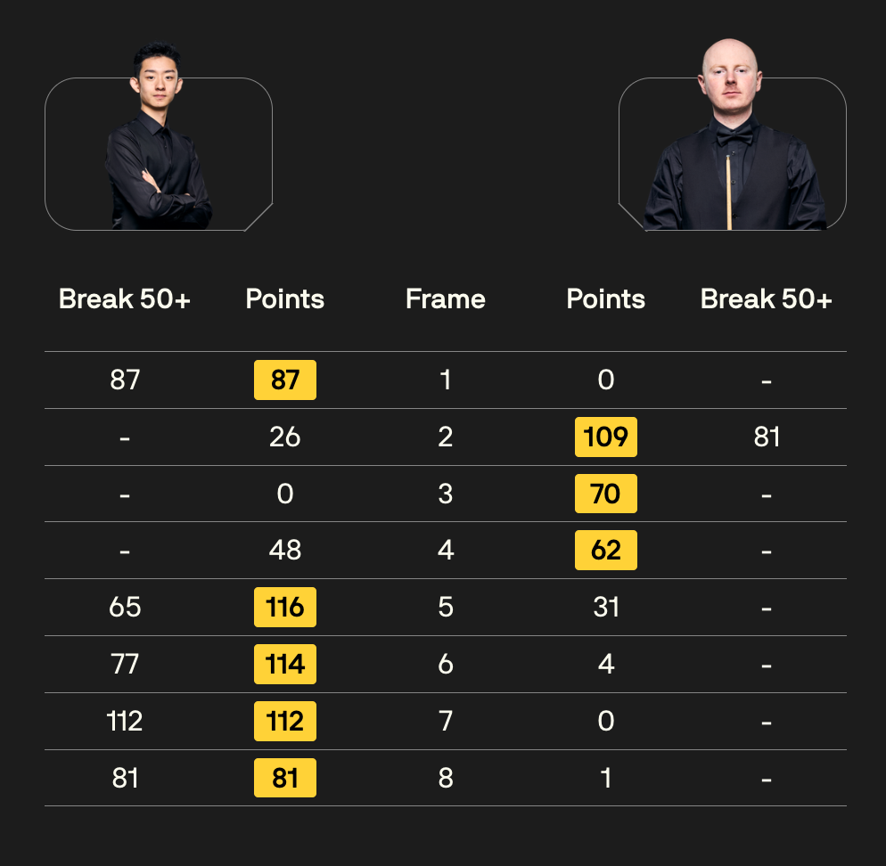 上半场,吴宜泽以1-3落后,休息归来后吴宜泽连下四局逆转取胜。全场比赛,吴宜泽打出一杆112分和四杆50+(87、65、77、81),麦克吉尔打出一杆81分。