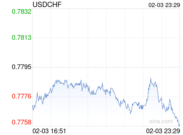 新浪外汇消息2026年02月03日,截至23时29分,外汇市场上美元兑瑞士法郎汇率跌破1美元兑换0.7756瑞士法郎。跌幅为-0.5003%