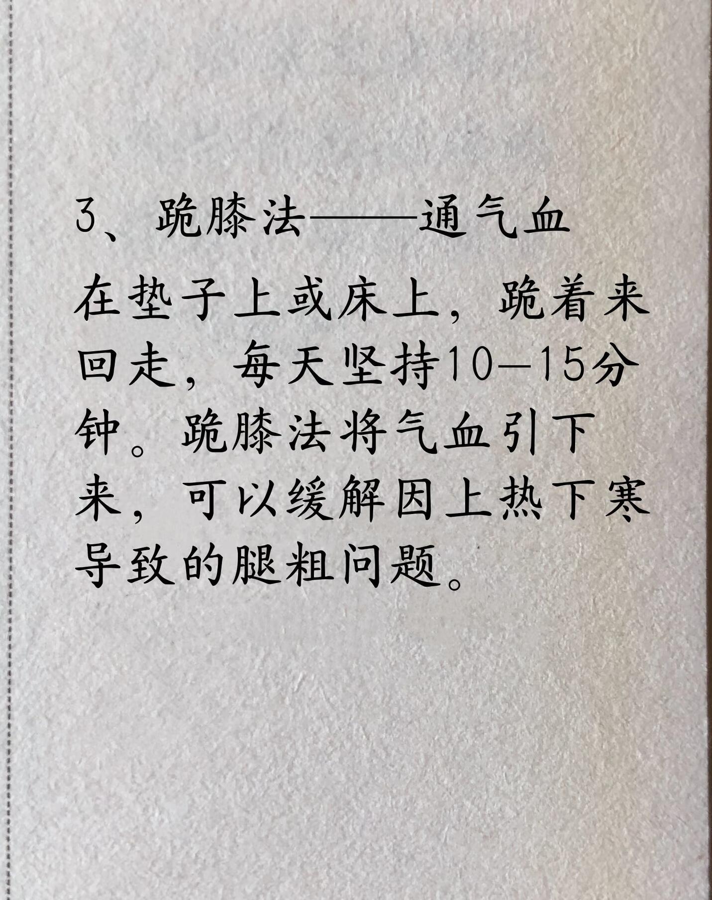3. 跪膝法——通气血在垫子上或床上,跪着来回走,每天坚持10—15分钟。跪膝法将气血引下来,可以缓解因上热下寒导致的腿粗问题。