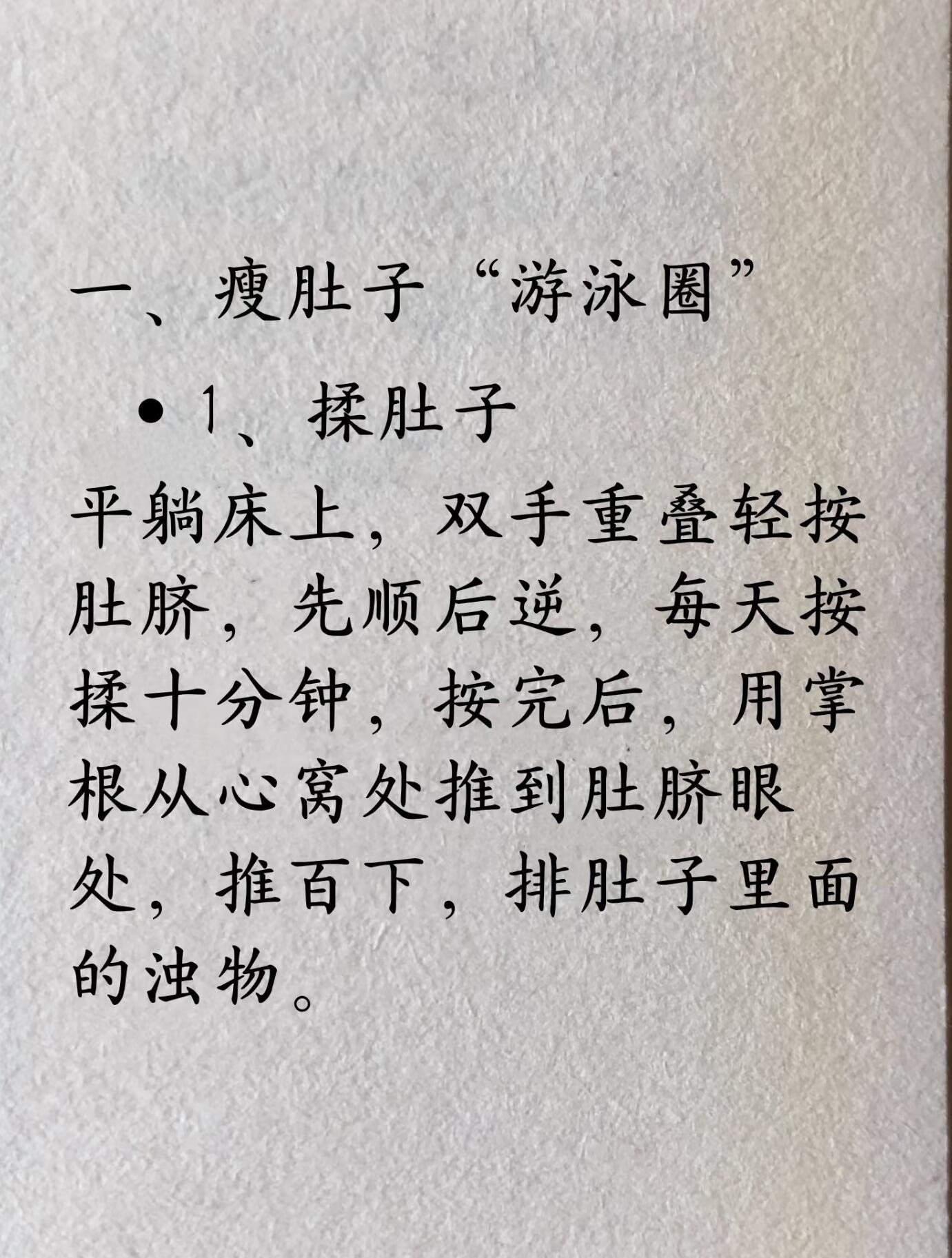《黄帝内经》中讲,减肥就是减废,把身体里面堆积的浊气排出去,气血畅通,身材也不会走样,但很多人减去的是人体的蛋白质等精华,结果自己没瘦下来,反而因为节食和过量运动伤了气血。一、瘦肚子“游泳圈”1. 揉肚子平躺床上,双手重叠轻按肚脐,先顺后逆,每天按揉十分钟,按完后,用掌根从心窝处推到肚脐眼处,推百下,排肚子里面的浊物。