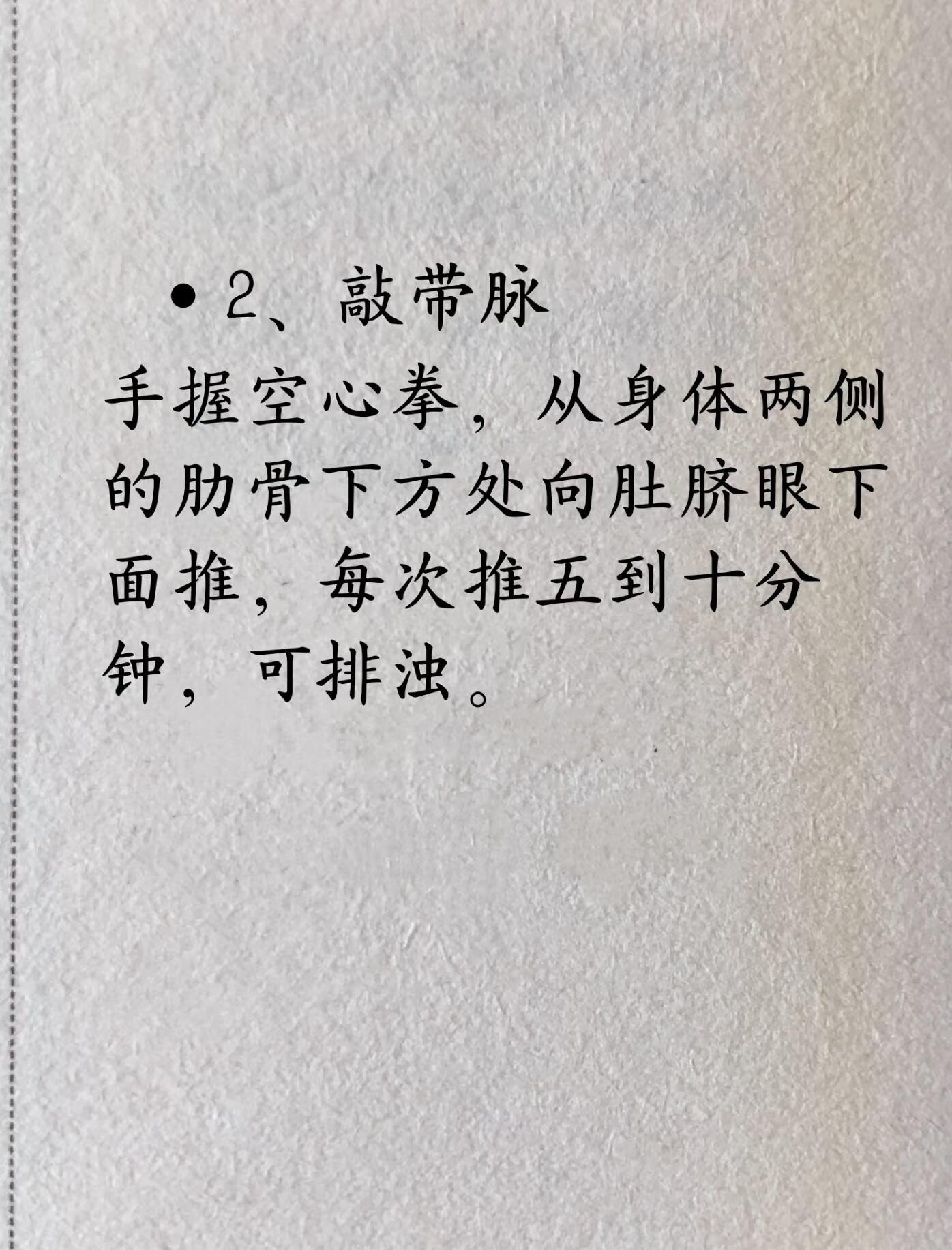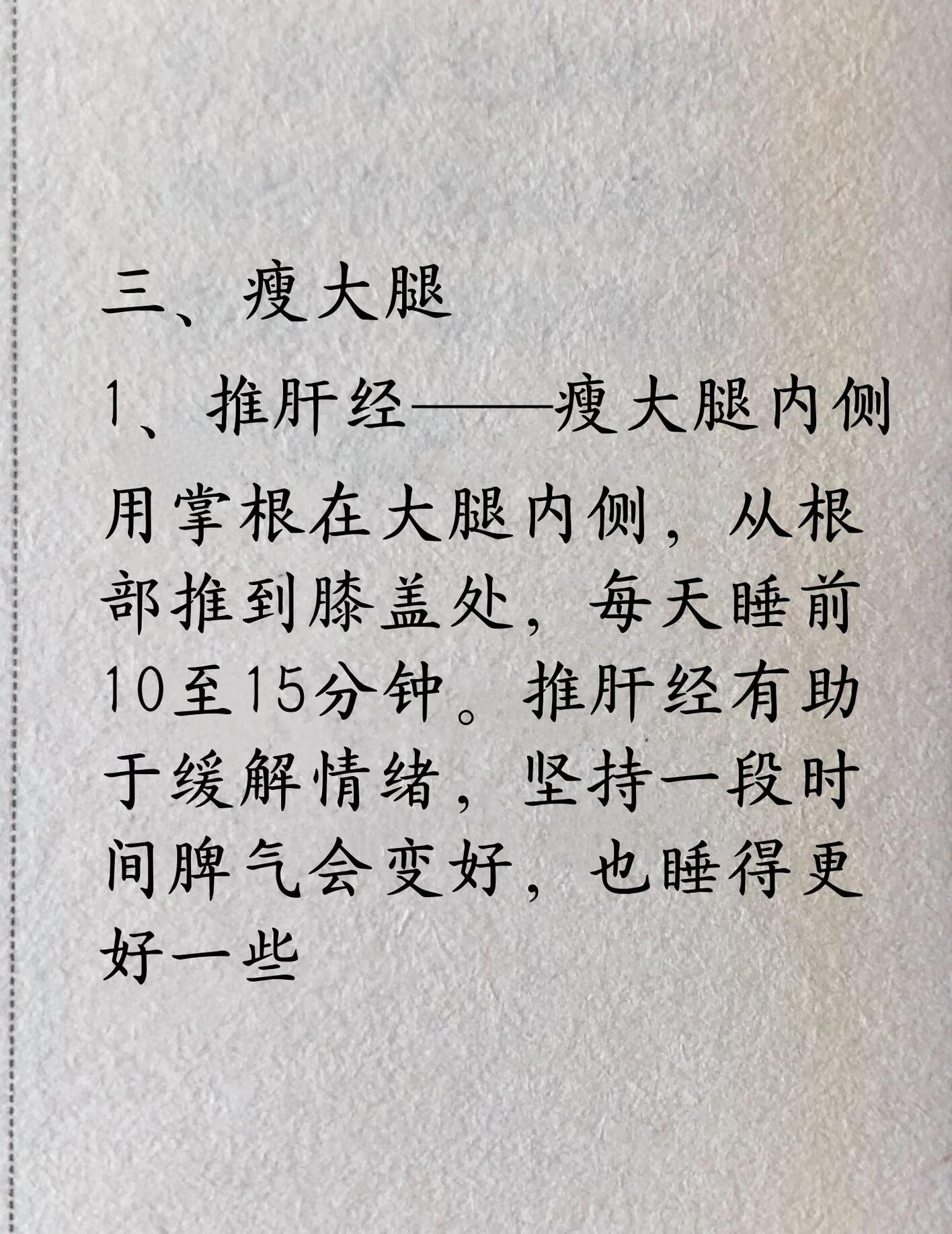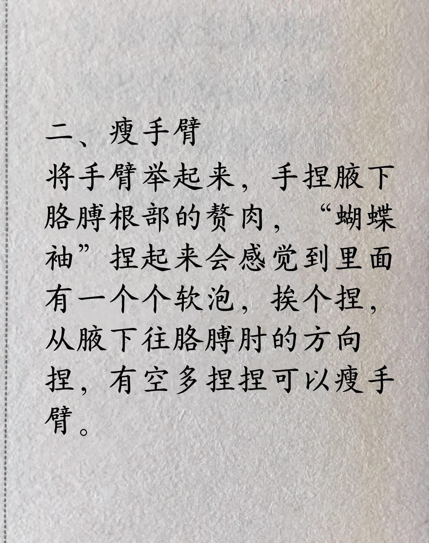 2. 敲带脉手握空心拳,从身体两侧的肋骨下方处向肚脐眼下面推,每次推五到十分钟,可排浊。二、瘦手臂将手臂举起来,手捏腋下胳膊根部的赘肉,“蝴蝶袖”捏起来会感觉到里面有一个个软泡,挨个捏,从腋下往胳膊肘的方向捏,有空多捏捏可以瘦手臂。三、瘦大腿1. 推肝经——瘦大腿内侧用掌根在大腿内侧,从根部推到膝盖处,每天睡前10至15分钟。推肝经有助于缓解情绪,坚持一段时间脾气会变好,也睡得更好一些