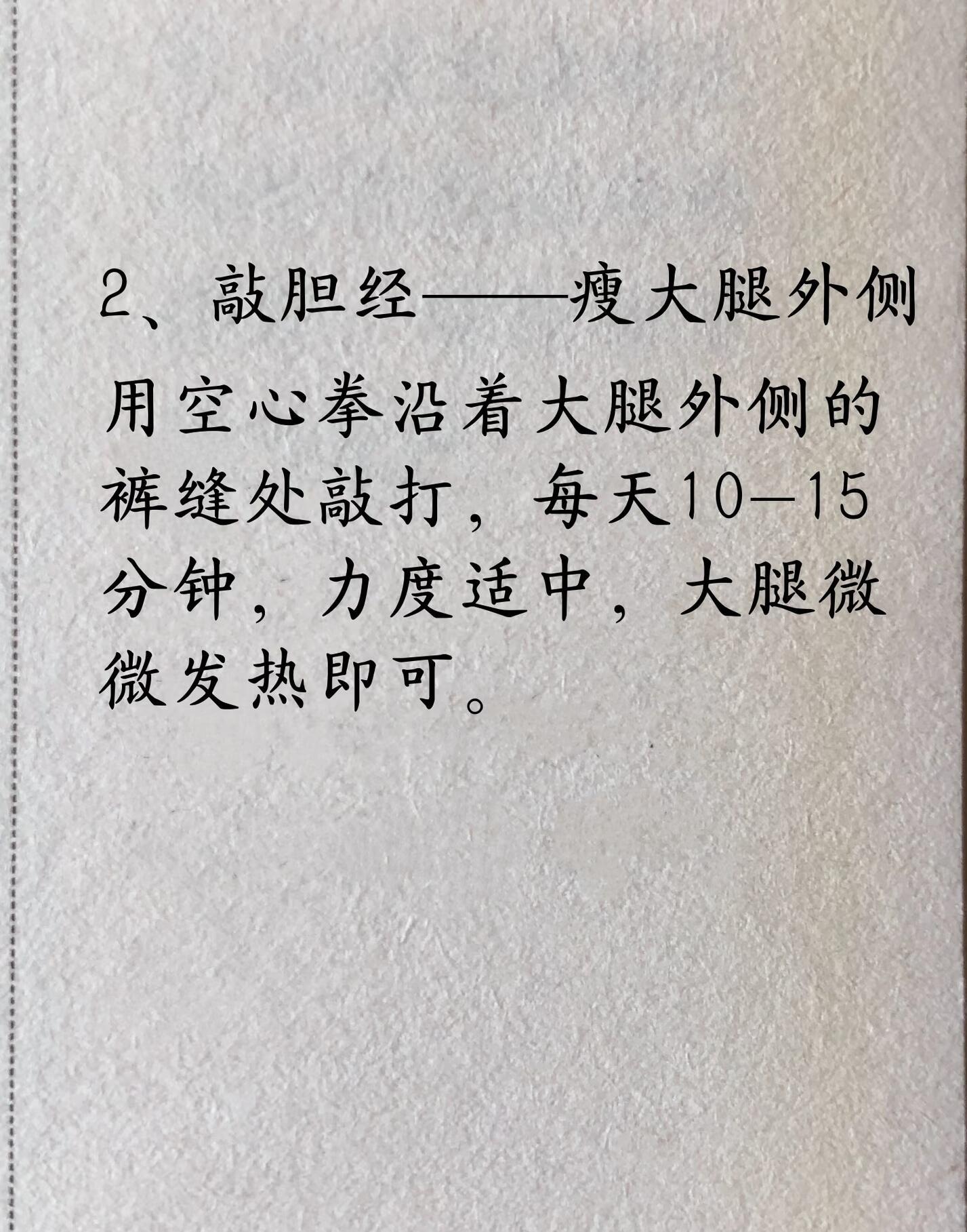 2. 敲胆经——瘦大腿外侧用空心拳沿着大腿外侧的裤缝处敲打,每天10—15分钟,力度适中,大腿微微发热即可。