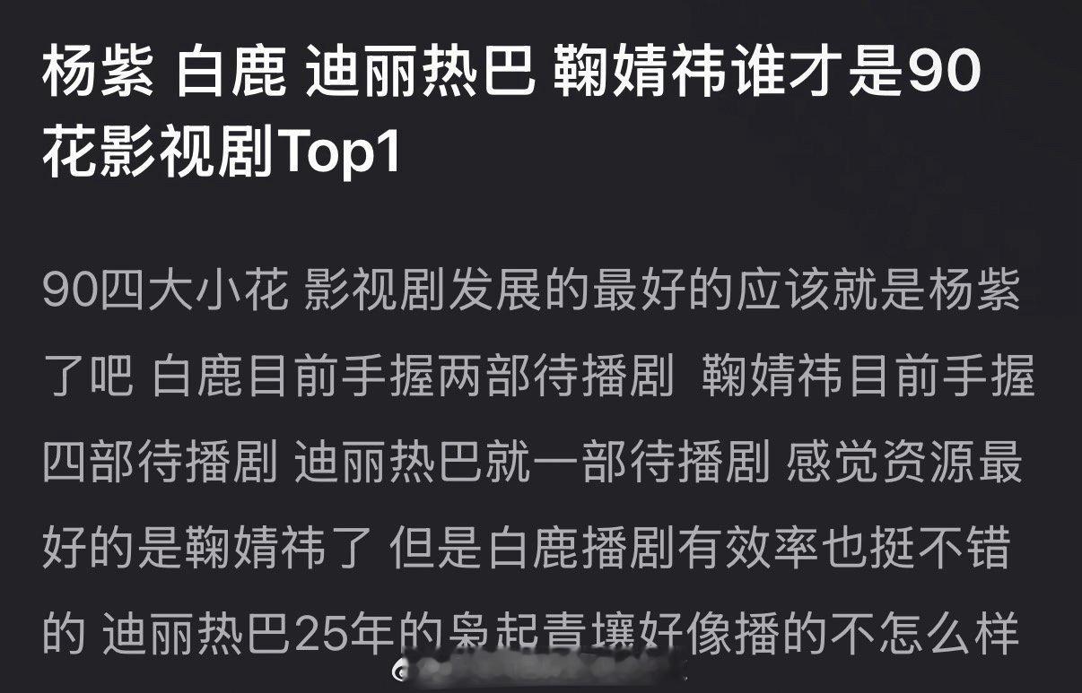 杨紫、白鹿、迪丽热巴、鞠婧祎,谁才是90花影视剧Top1?