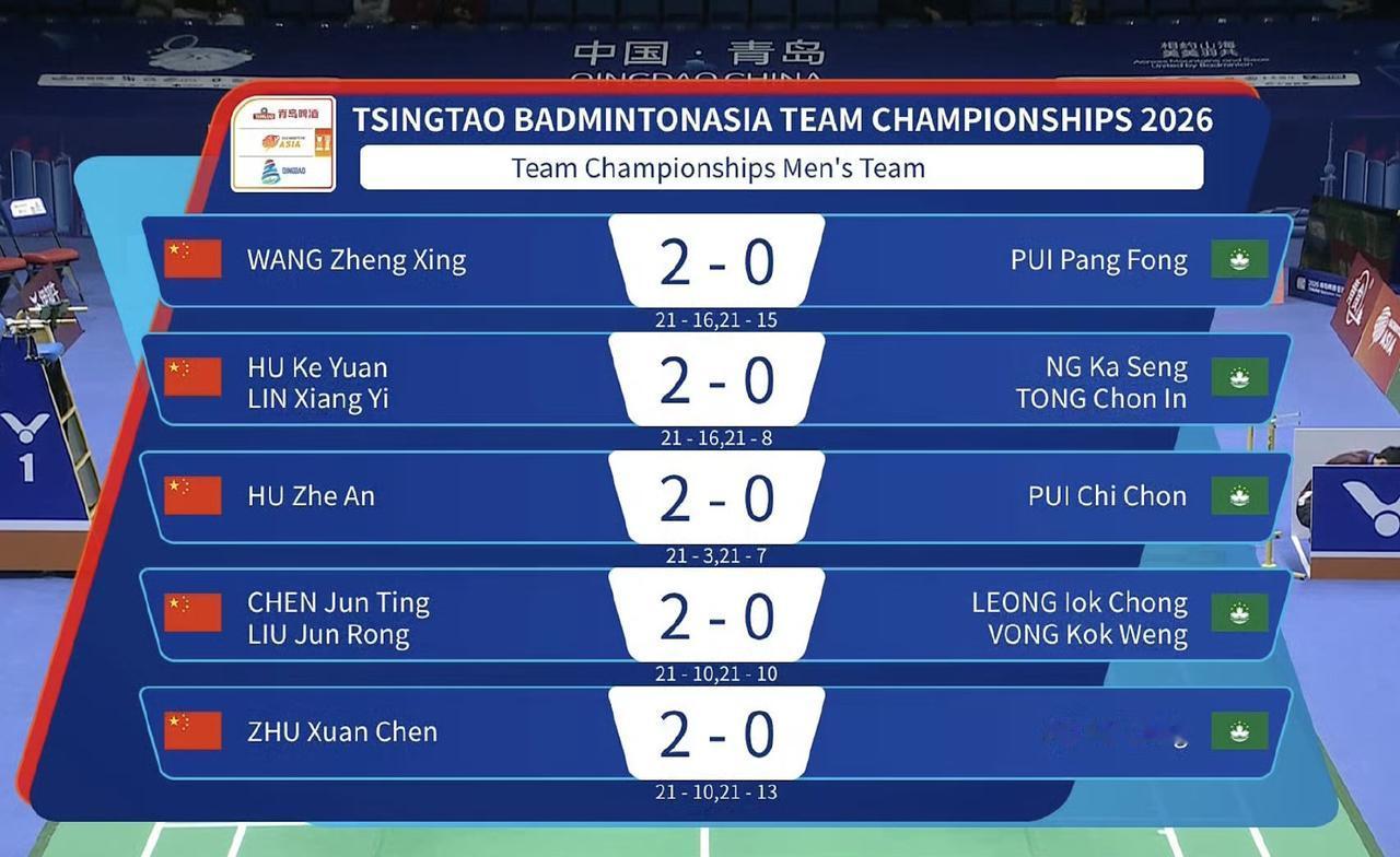男团A组:中国 5-0 中国澳门 2026年 亚洲羽毛球团体锦标赛,男团A组,中国队对阵中国澳门队。 王正行 21-16、21-15 裴鹏锋 胡珂源/林祥毅 21-16、21-8 吴嘉盛/董俊延 胡哲安 21-3、21-7 裴梓臻 陈俊廷/刘峻荣 21-10、21-9 梁钰聪/黄觉永 朱轩辰 21-10、21-13 欧非龙