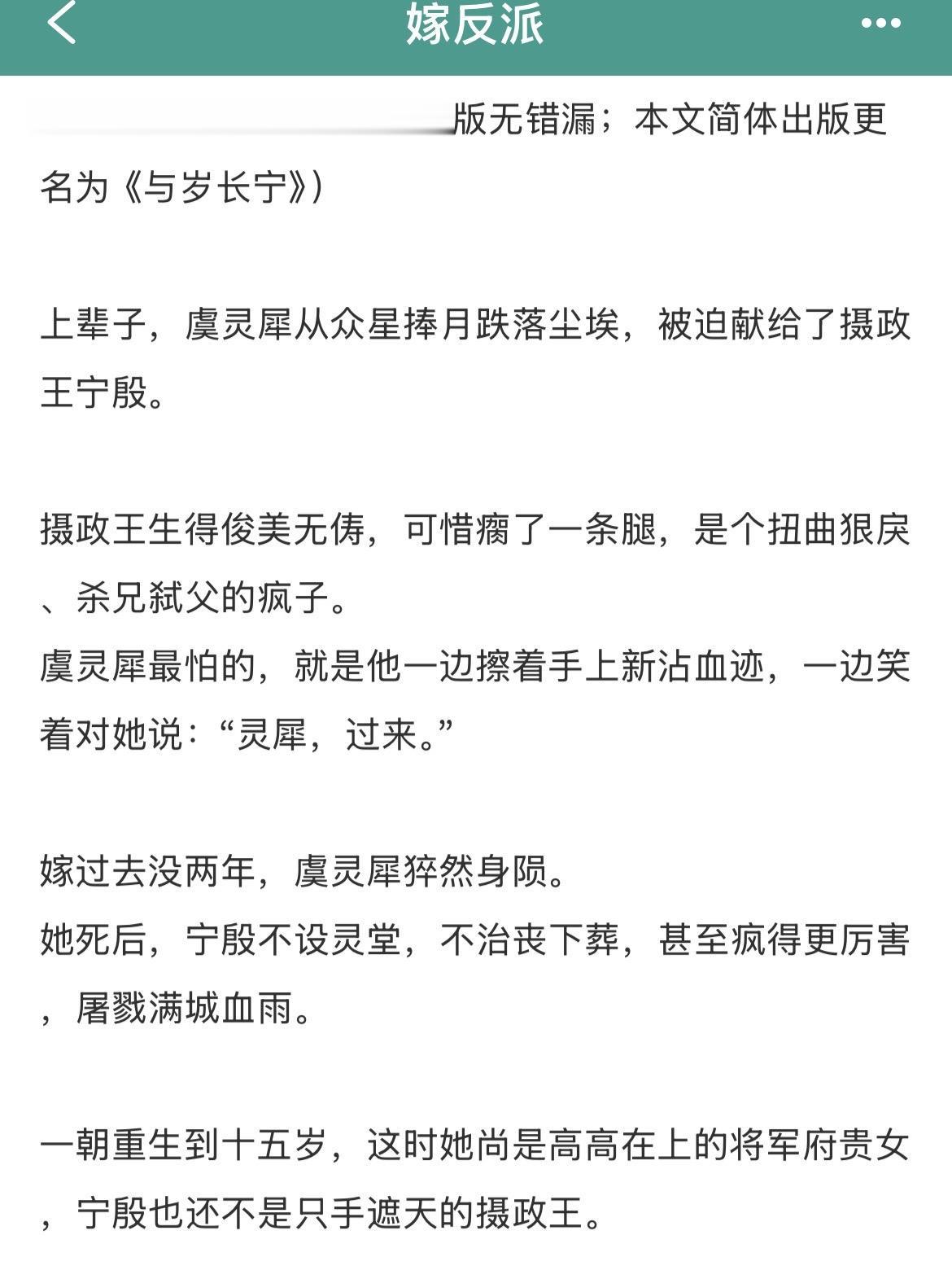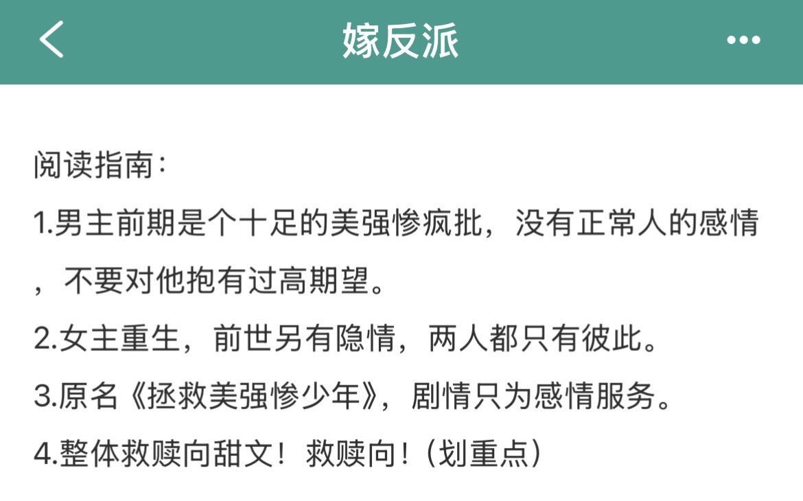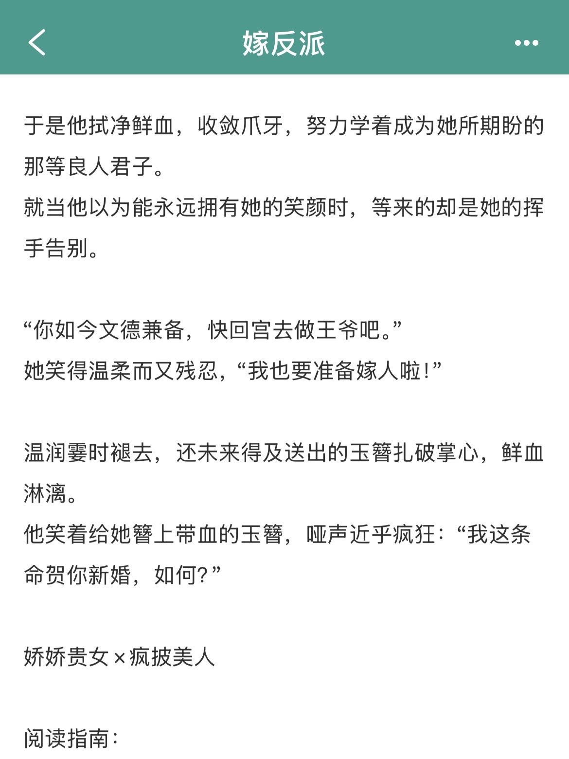 重生娇娇贵女vs美强惨疯披美人。重生娇娇贵女vs美强惨疯披美人 ※男主前期是个十足的美强惨疯批,没有正常人的感情,不要对他抱有过高期望。 ※女主重生,前世另有隐情,两人都只有彼此。 ※整体救赎向甜文!救赎向!(划重点)。 书名:《嫁反派》 作者:布丁琉璃 标签:古言小说、轻松文、重生文、甜文、完结文