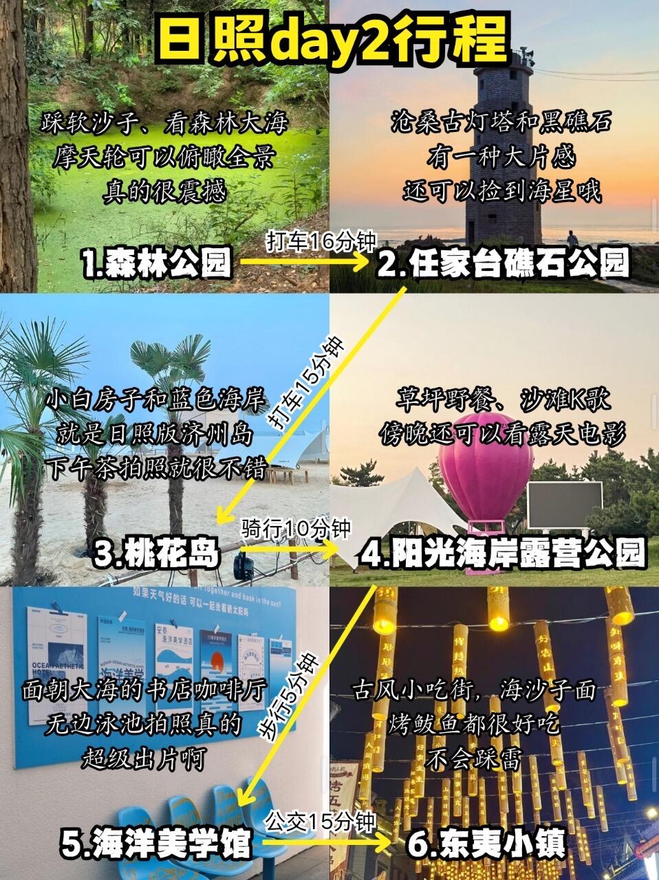 ✔️Day2:海滨森林公园→任家台礁石公园→桃花岛→阳光海岸露营公园→海洋美学馆→东夷小镇