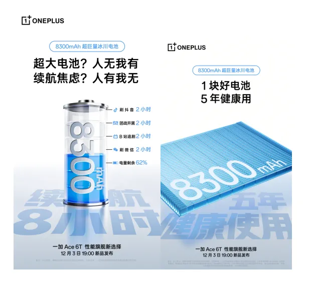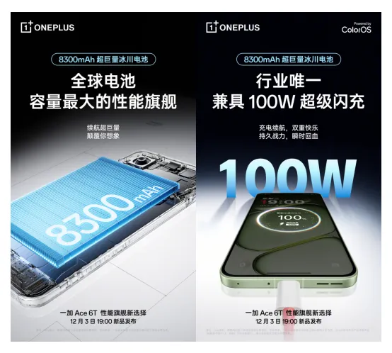 2025年11月28日,一加 Ace 6T官宣首发8300mAh超巨量冰川电池,引领性能旗舰迈入 8000+mAh 超巨量时代,同时支持100W 超级闪充,是行业唯一同时兼具8300mAh 电池和百瓦闪充的手机。本次发布的一加 Ace 6T旗舰配置全面升级,首发全球当代旗舰芯第五代骁龙8,搭载全新一代「风驰游戏内核」,更有8300mAh超巨量冰川电池,实力强悍,将于12月3日晚7点正式发布。