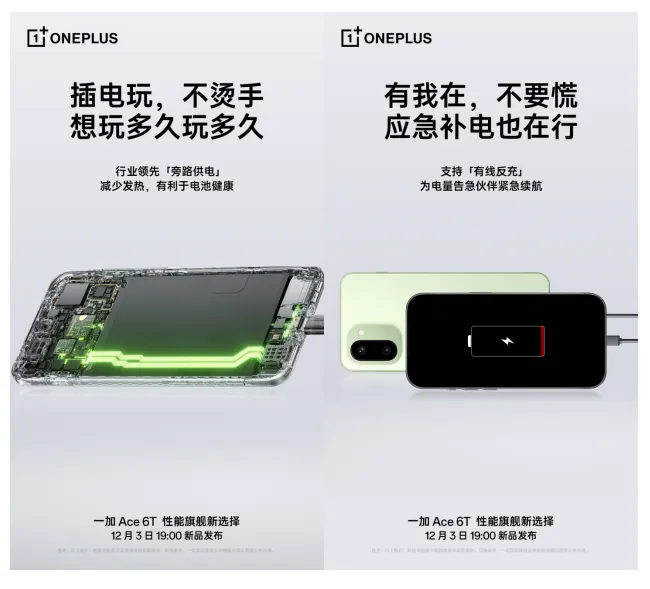 此外,一加Ace 6T支持「旁路供电」和「有线反充」两大充电技术。行业领先的「旁路供电」功能,让一加Ace 6T在边充电边游戏的场景中,电流能绕过电池,直供系统,避免发热升温导致的卡顿,有效延长电池寿命。而有线反充则能为电量告急的其他设备,手表、耳机等产品紧急补电,减少续航烦恼。