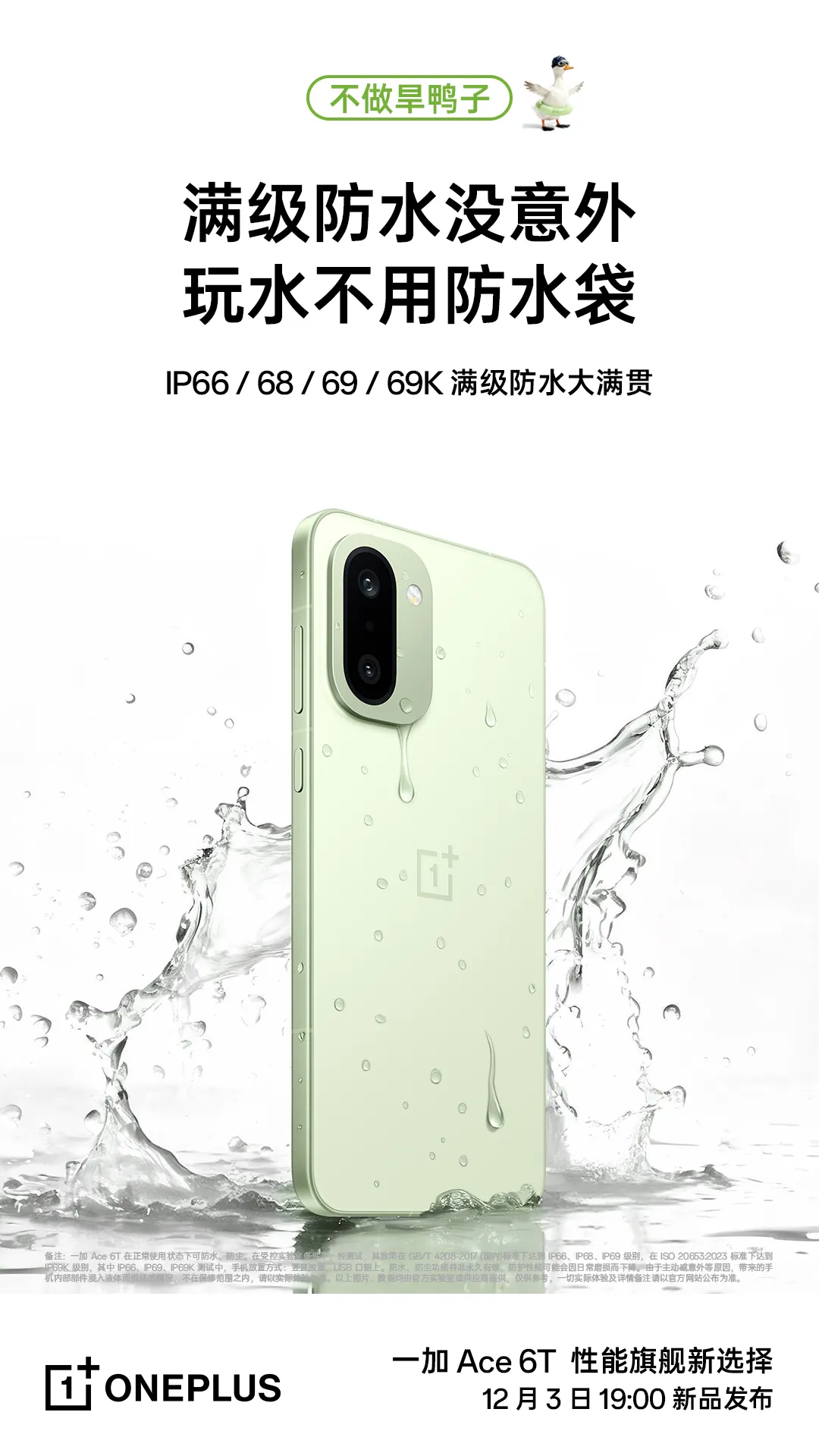 设计上,一加 Ace 6T延续简约质感美学,带来「掠影绿」、「电光紫」与「闪速黑」三款全新配色,机身采用 OPPO 晶盾玻璃,抗摔性能提升160%,更有旗舰金属中框硬核架构,无惧跌落,防水等级则实现了 IP66/68/69/69K 满级防水。