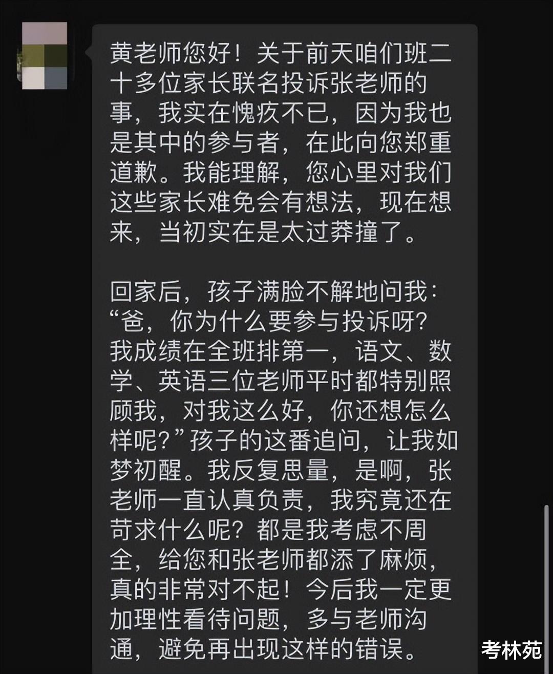 从当事家委会会长所发内容来看,他以及其他20多位家长在数天前联名投诉了班主任,得知此事后,孩子回家满脸不解的问爸爸为什么要参与投诉,他成绩全班排名第一,多亏了平时老师们的特别照顾,这让他愧疚不已,认为如果自己平时能够更加理性的看待问题,多与老师沟通,事情也不至于发展到这个地步。