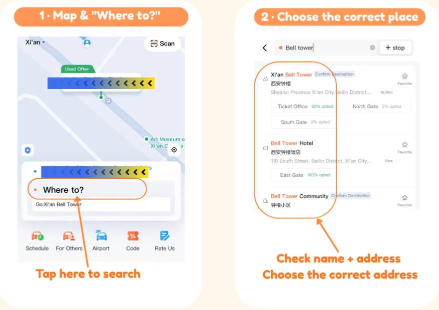 Set your pickup & destination You start from the map: check where you are, then tell DiDi where you want to go.