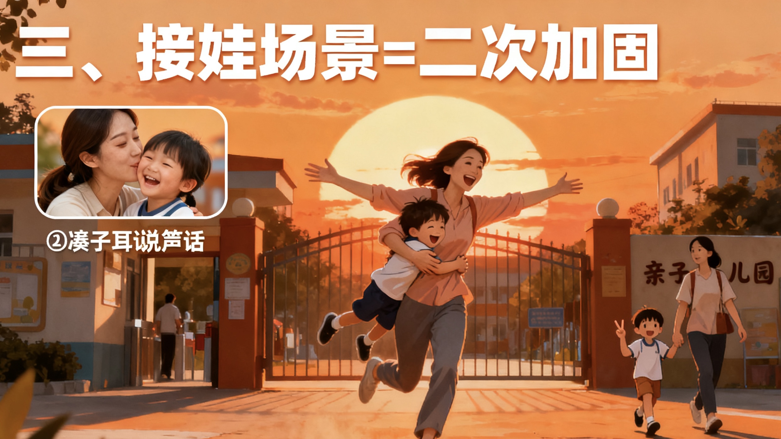 很多家长一接到孩子就狂问“吃饱没”“哭没哭”,结果把娃重新拉回焦虑。正确打开方式: