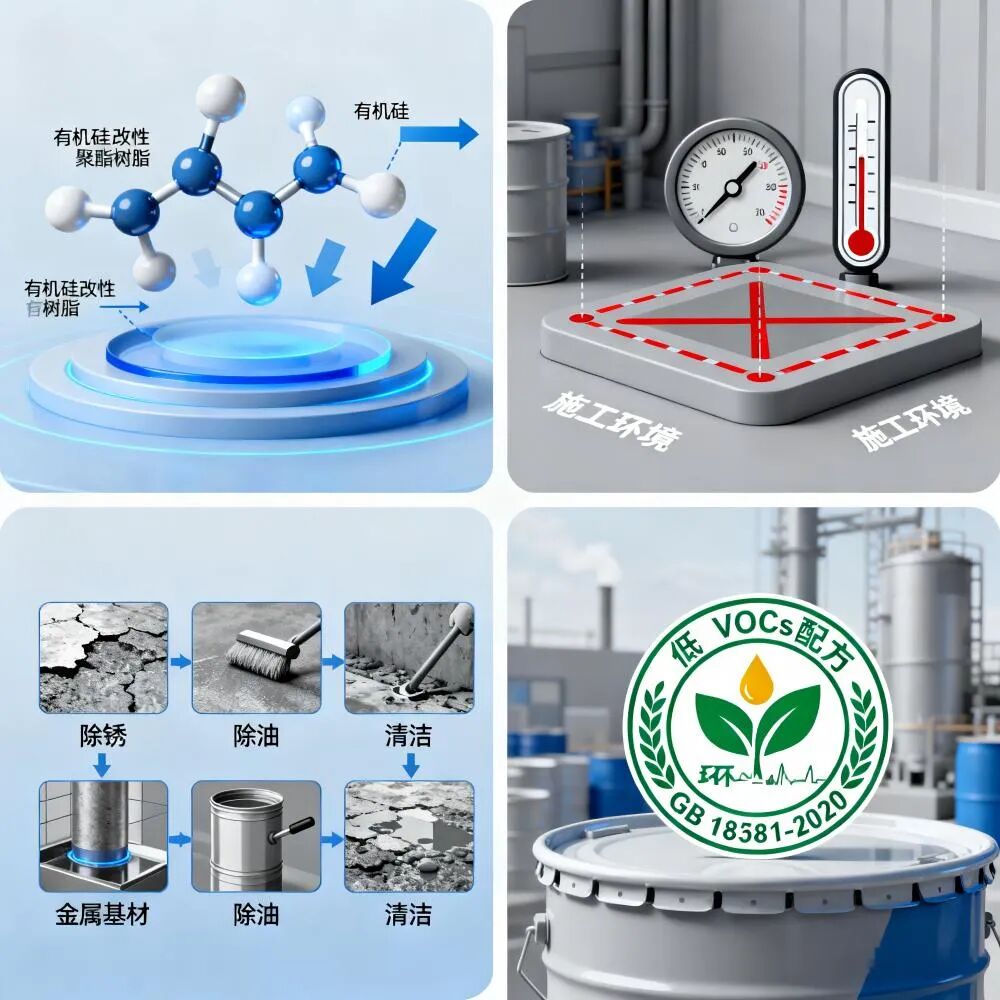 2.施工环境:避免在高湿度(>85%)或低温(<10℃)环境施工,否则影响漆膜固化效果;