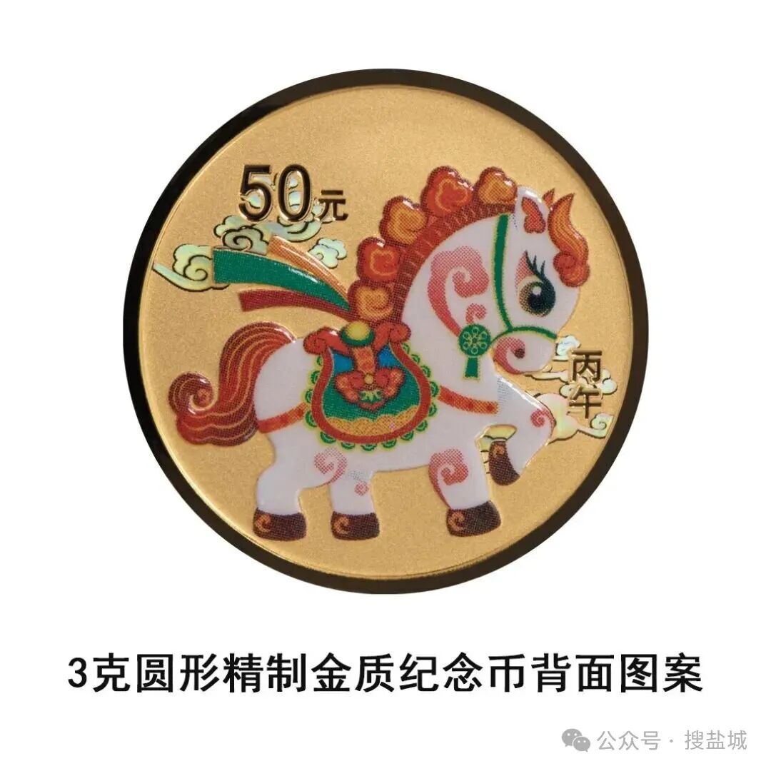 3克圆形金质纪念币背面图案为装饰马造型,衬以祥云组合设计,并刊“丙午”字样及面额。